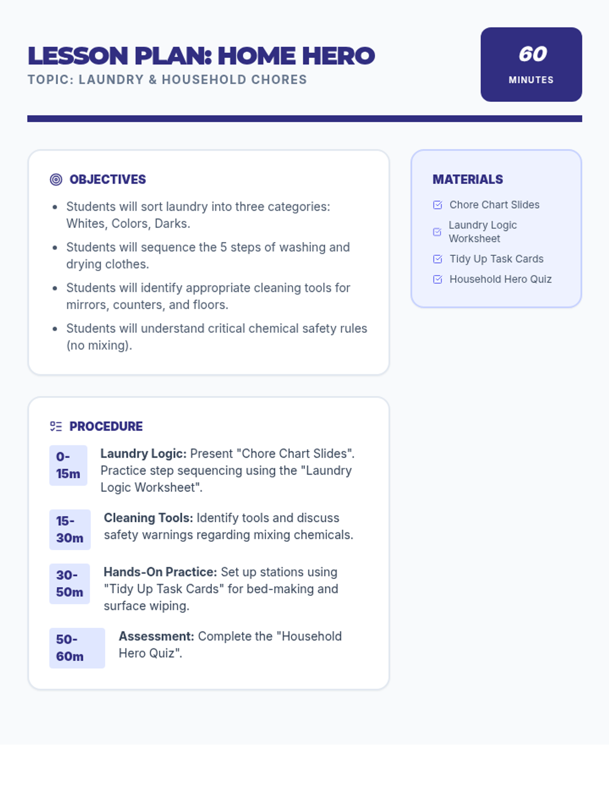 A printable teacher's lesson plan for Home Hero, covering laundry sorting, chores, tool safety, and station-based learning activities.