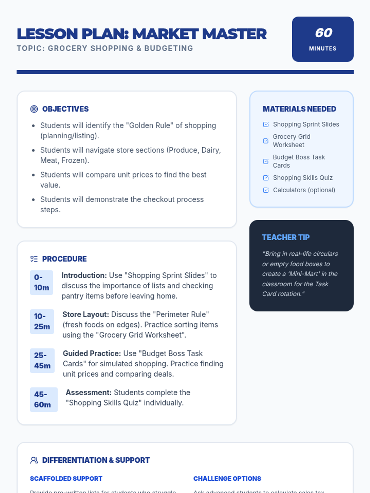 A printable teacher's lesson plan for Market Master, covering objectives, a 60-minute procedure, materials checklist, and differentiation strategies for shopping skills.