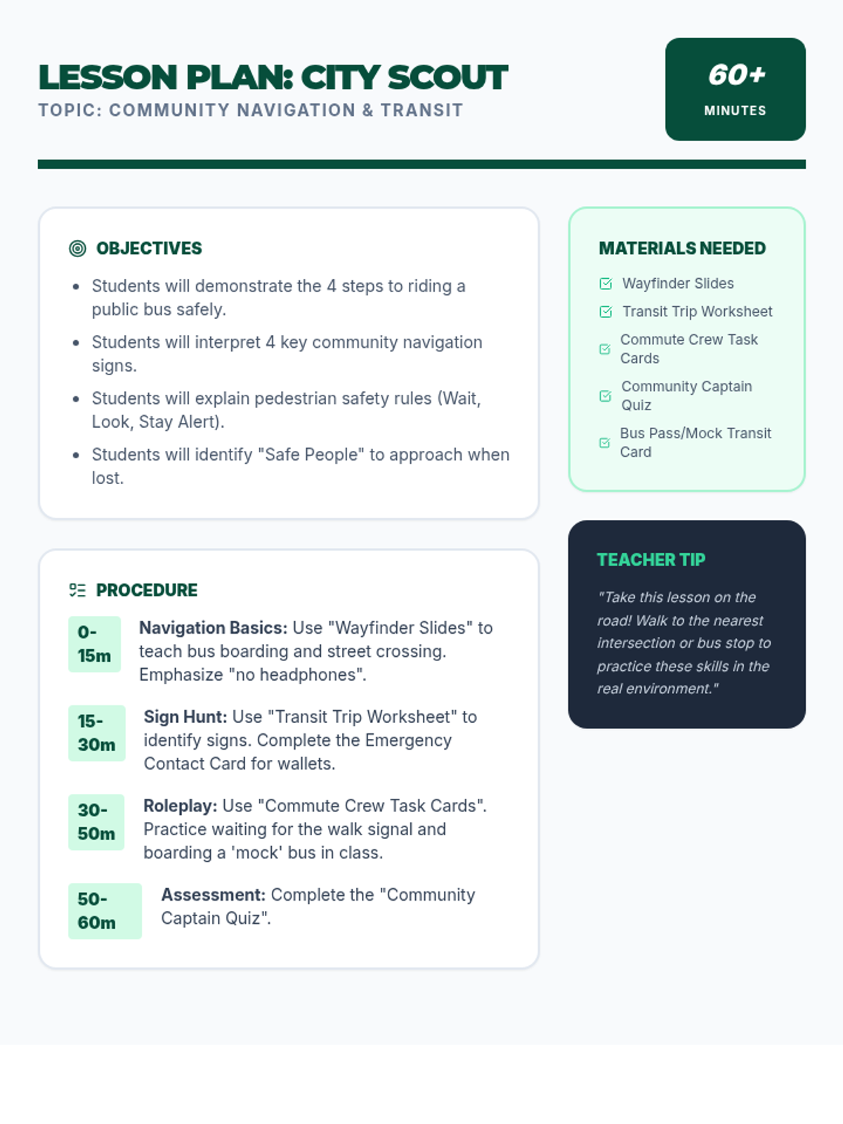 A printable teacher's lesson plan for City Scout, covering community navigation, bus safety, pedestrian rules, and emergency preparedness.