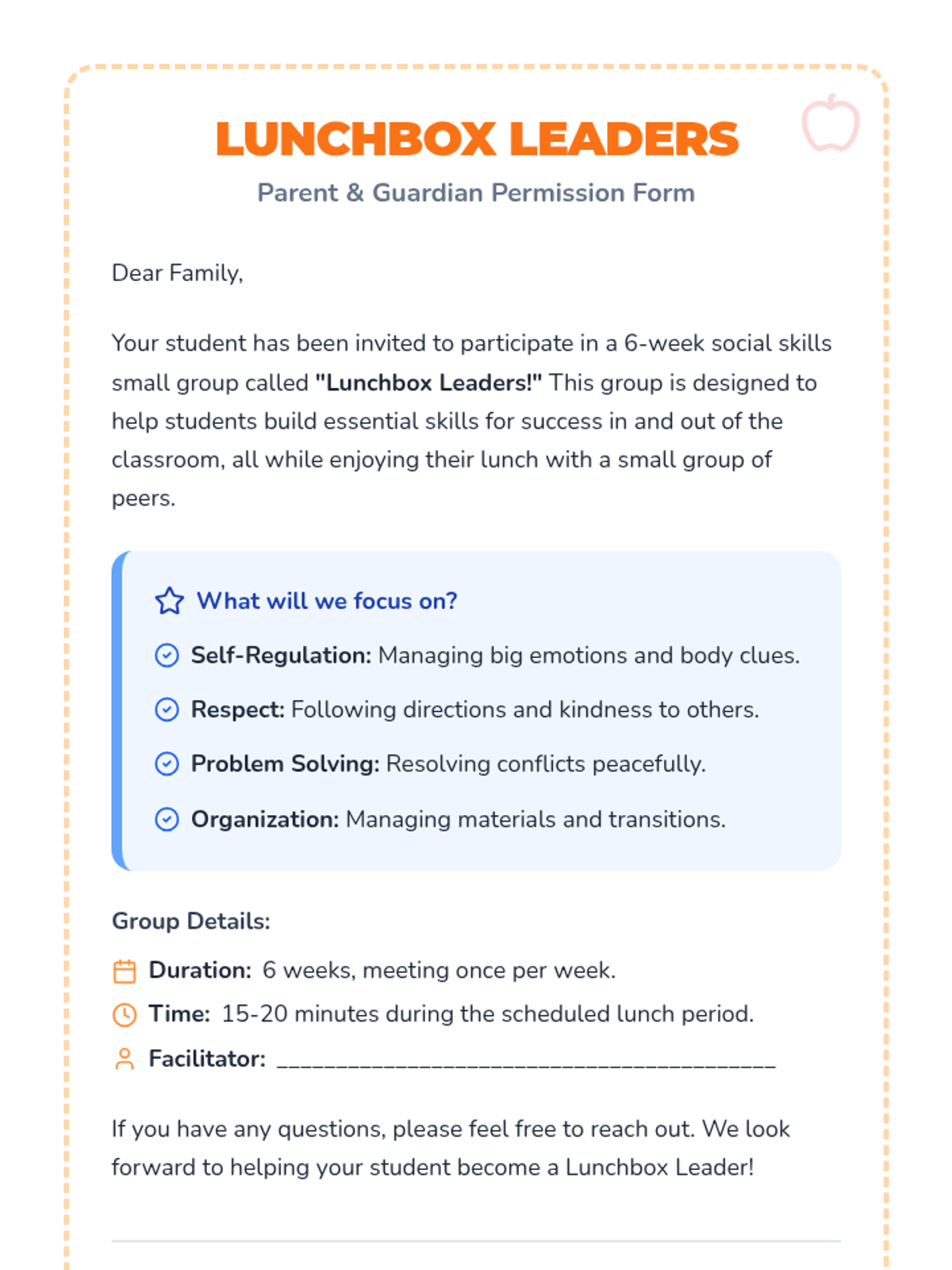 A parent permission form for the Lunchbox Leaders program, outlining the 6-week curriculum and gathering parental consent for student participation.