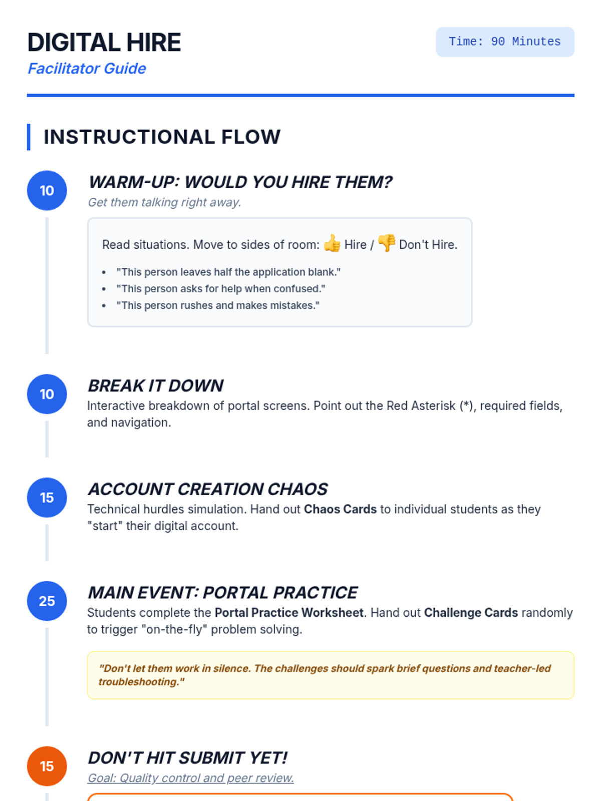 A detailed 90-minute facilitator guide for a body language workshop, featuring scenario breakdowns for workplace, shopping, healthcare, and social settings. Revised for better page flow and contrast.