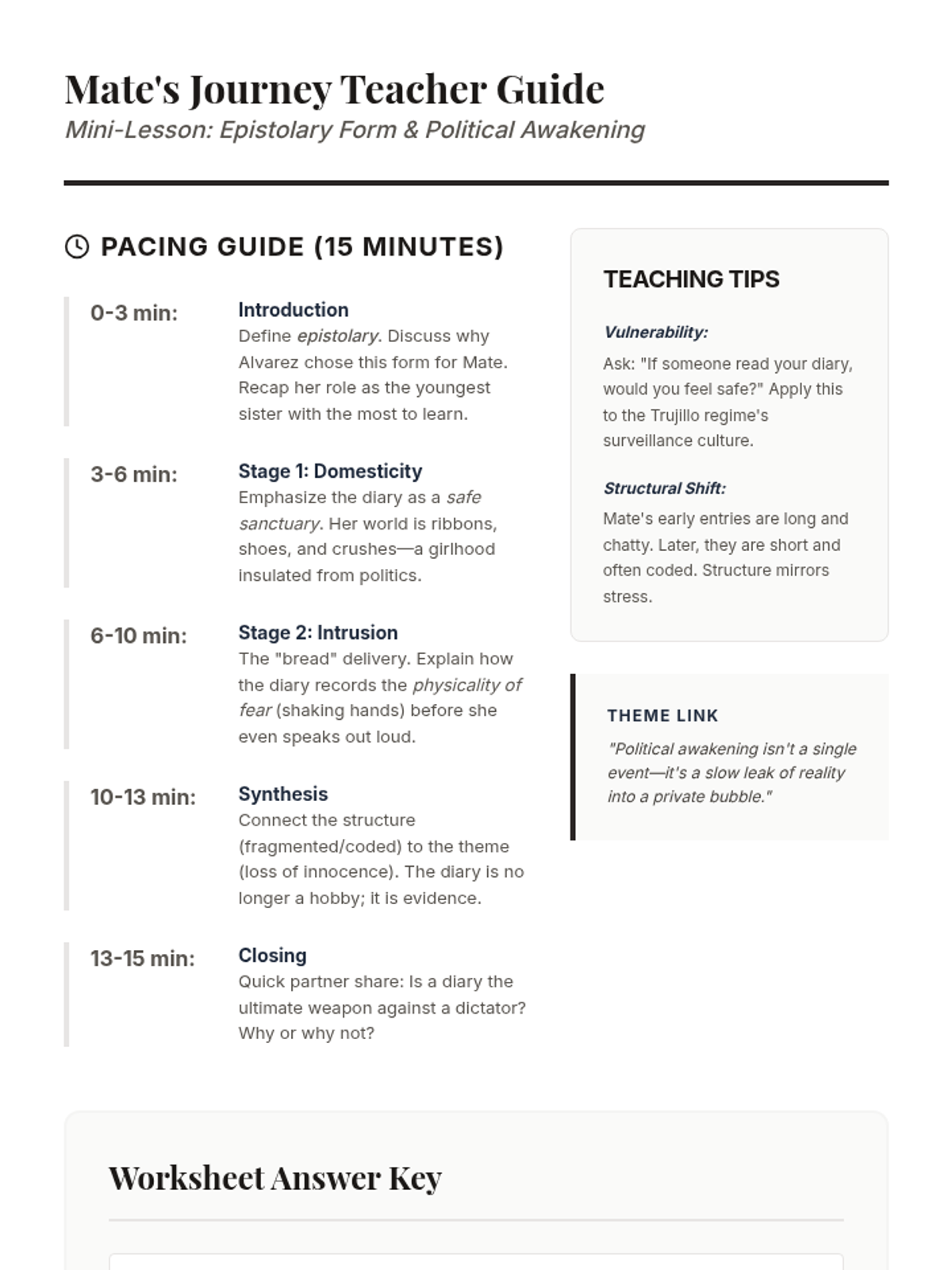 A teacher guide for the 15-minute mini-lesson on Maria Teresa's epistolary narration. Includes a pacing guide, key teaching points, and an answer key for the 'Private Pages' worksheet.