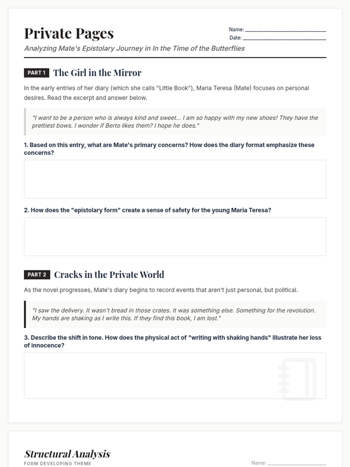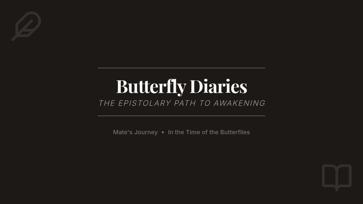 A slideshow designed for a 15-minute mini-lesson on Maria Teresa's epistolary narration in 'In the Time of the Butterflies'. It visually guides students through the transition from personal diary entries to political records, connecting this structural shift to the theme of loss of innocence.