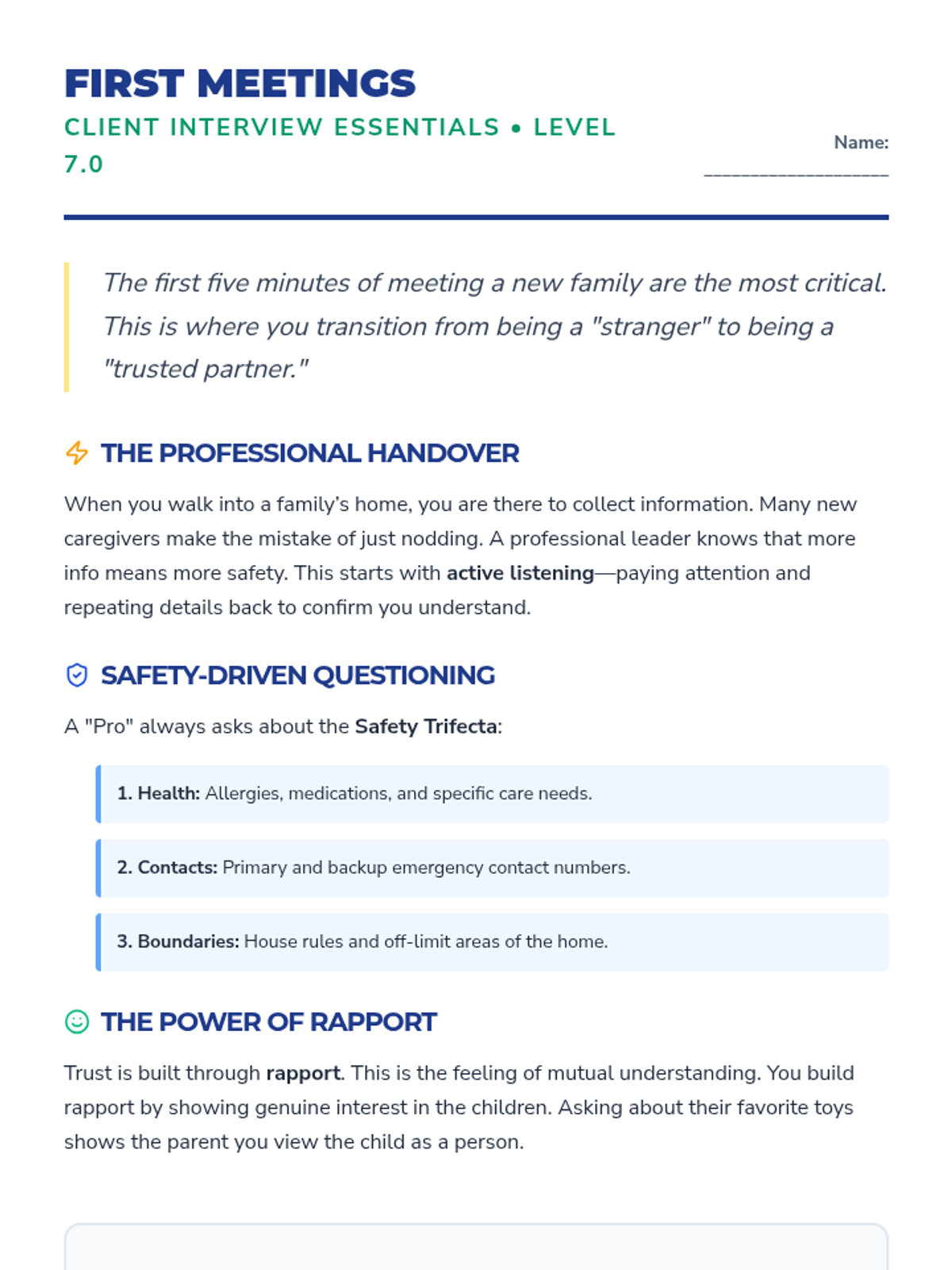 A 7th-grade level reading about professional parent-caregiver interviews, active listening, and building rapport. Revised for expanded answer areas.
