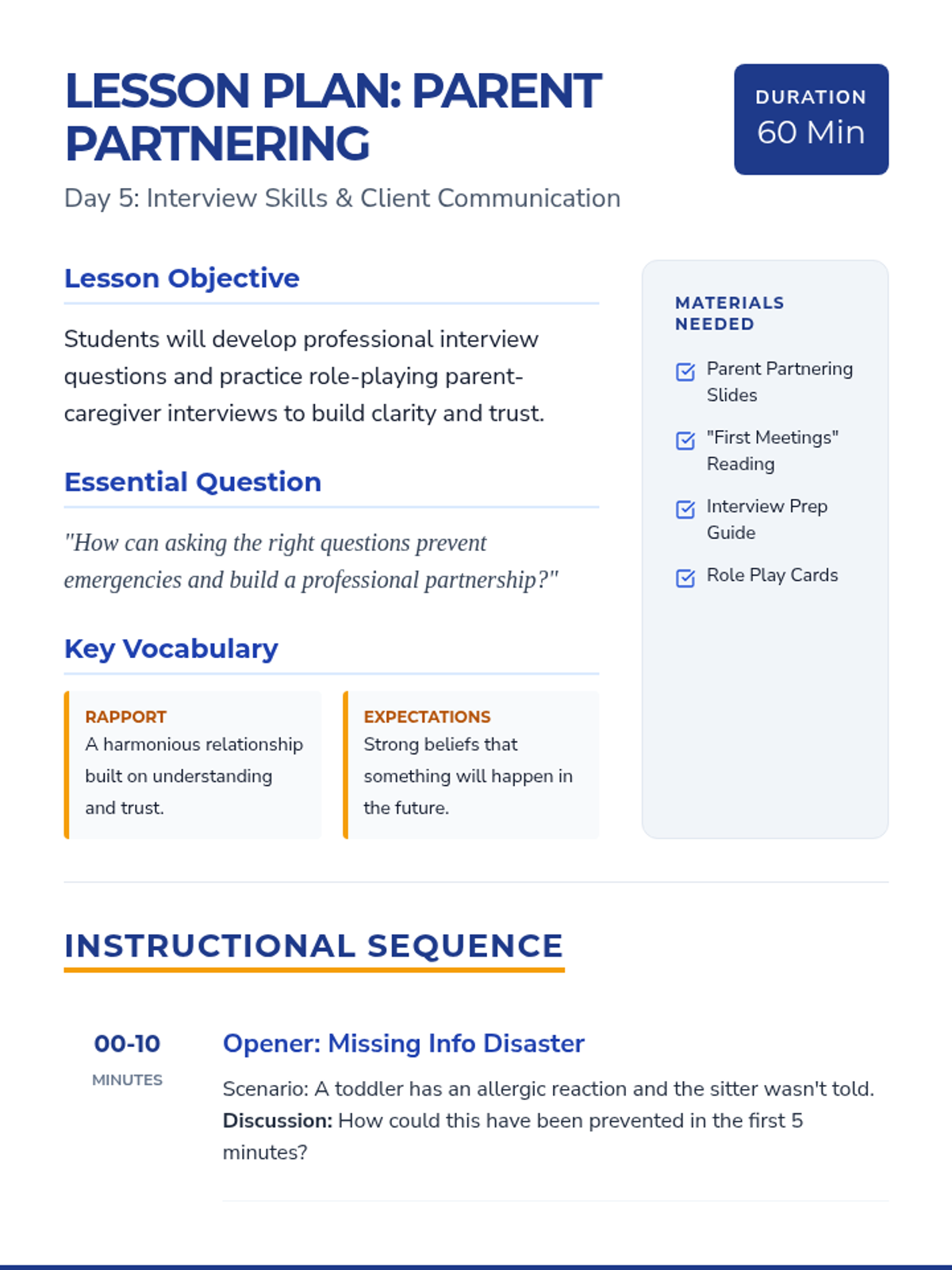 Lesson plan for Day 5, focusing on family interview skills and communication. Includes instructional scripts for role-play activities and question bank development. Revised for improved page breaks and content density.