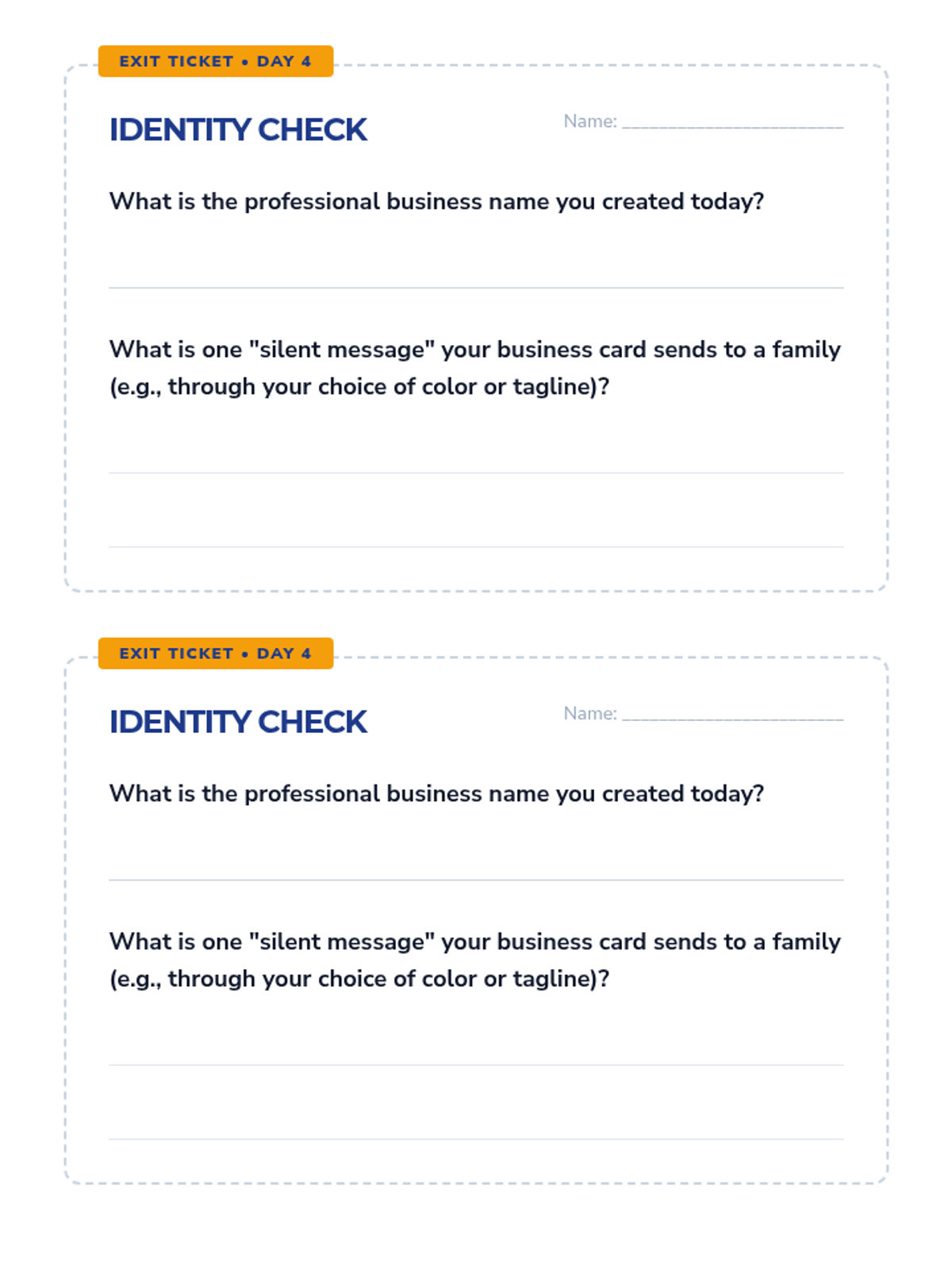 Exit ticket for Day 4, asking students to reflect on their business name and the messages conveyed by their branding.