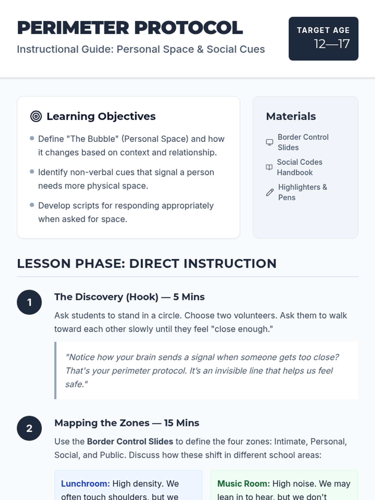 A detailed instructional guide for teachers covering lesson phases, specific social cue instruction, and role-play scenarios for middle and high school students.