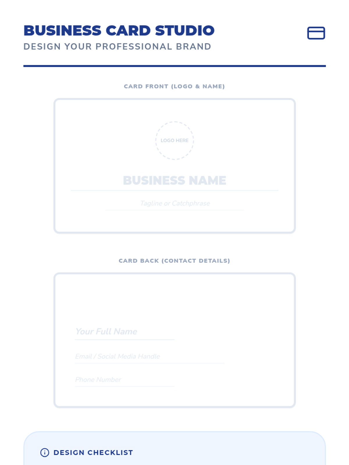 A business card design template for students to create their own professional branding. Revised to remove placeholder text and fit on one page.