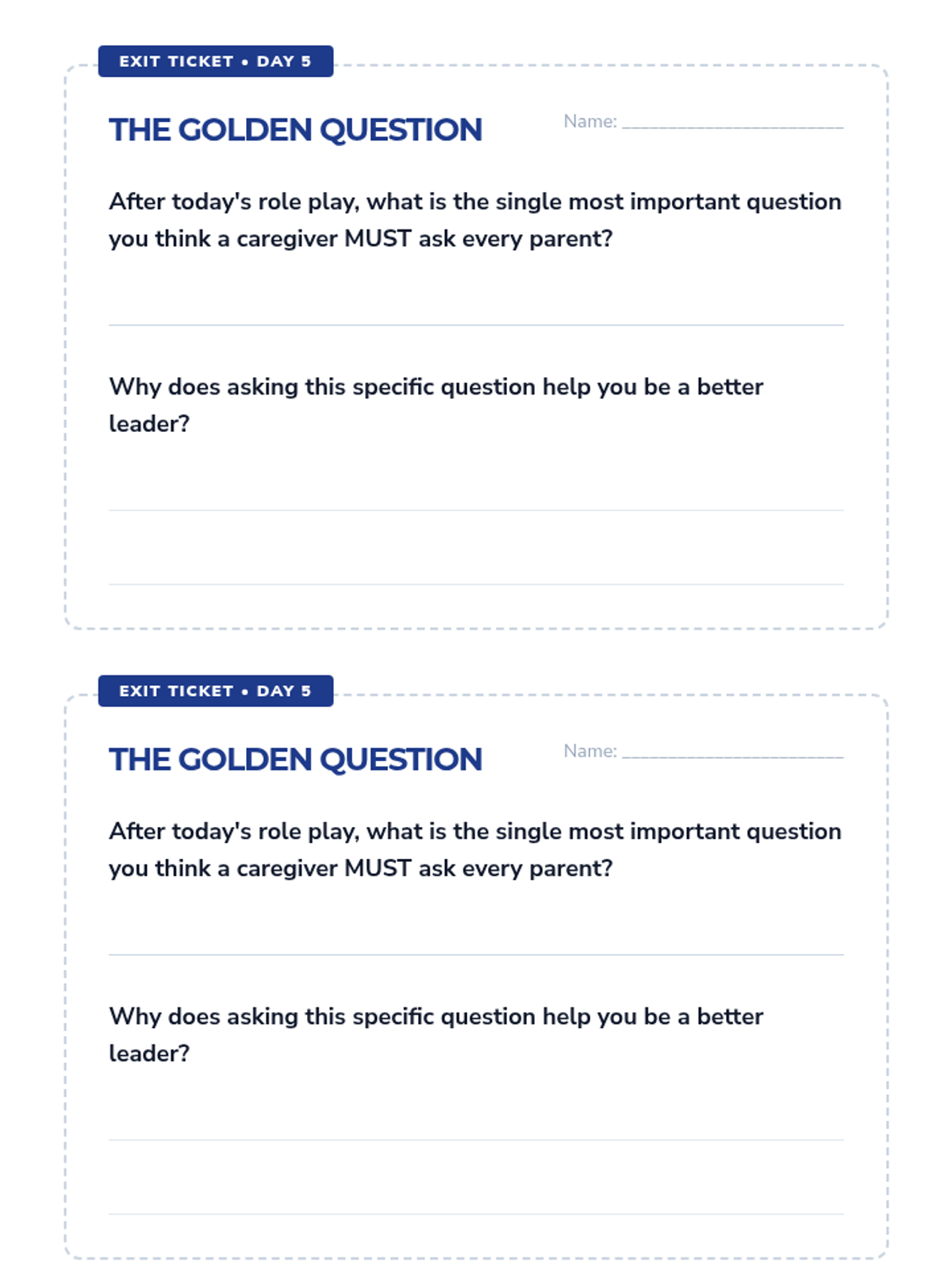 Exit ticket for Day 5, reflecting on the most critical interview questions for establishing caregiver leadership.