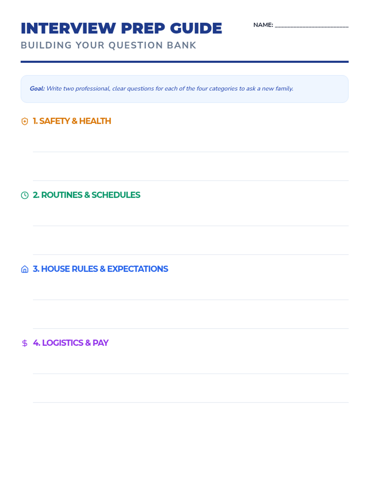 A worksheet for students to brainstorm and categorize professional interview questions. Revised to fit all content on a single page with optimized writing areas.