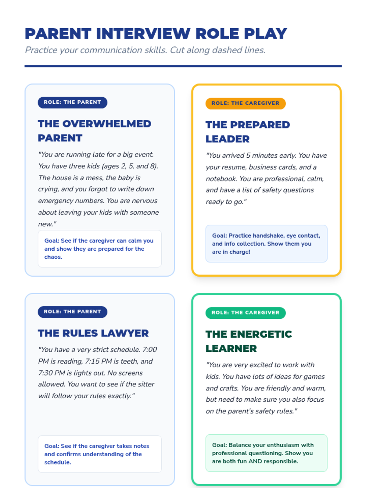 Role-play character cards for practicing caregiver-parent interviews. Revised for balanced roles, improved spacing, and response space.