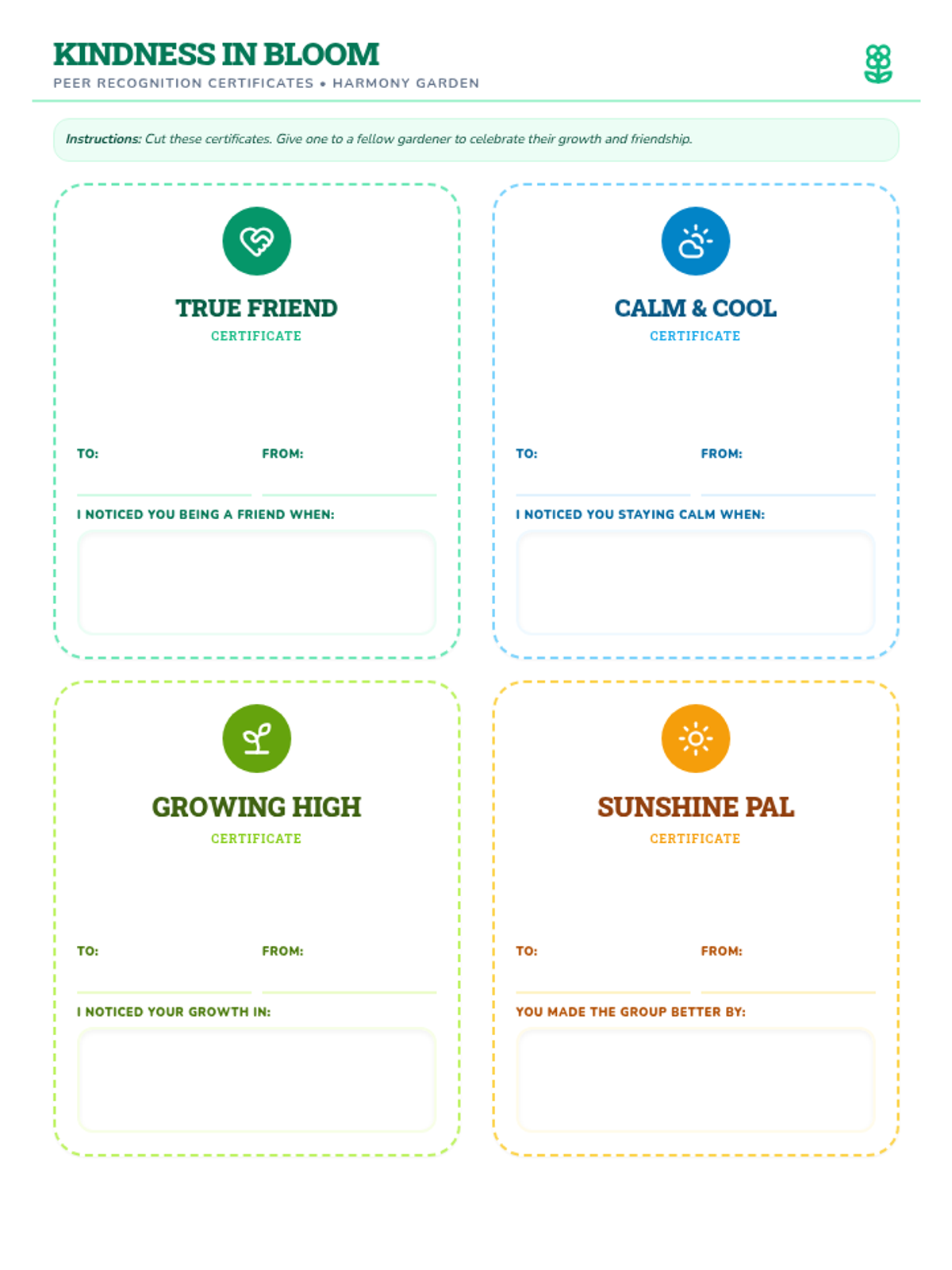 A set of 4 printable peer-recognition cards themed as 'kindness certificates'. Students recognize peers for being a true friend, staying calm, showing growth, or contributing positively to the group.