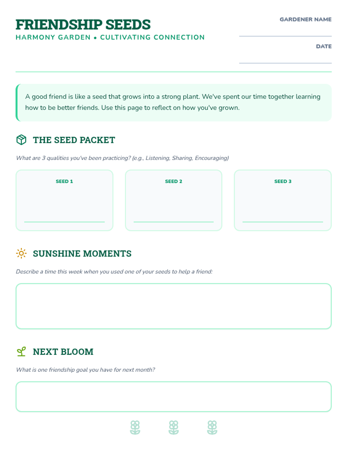 A student-facing worksheet where participants identify the positive friendship qualities they have developed ('seeds'), reflect on a recent success, and set a specific goal for future social growth.