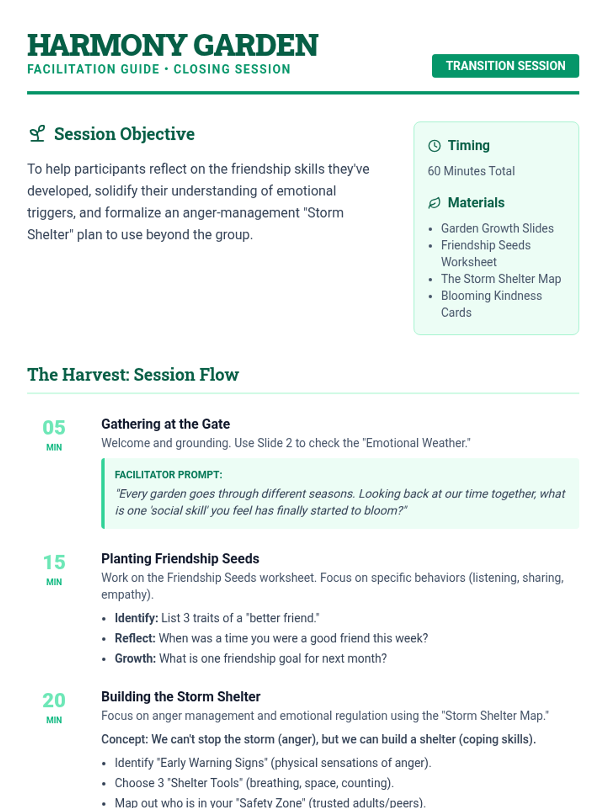 A comprehensive facilitator guide for the 'Harmony Garden' closing session, featuring a timed agenda, instructional prompts, and strategies for guiding discussions on friendship and emotional regulation.