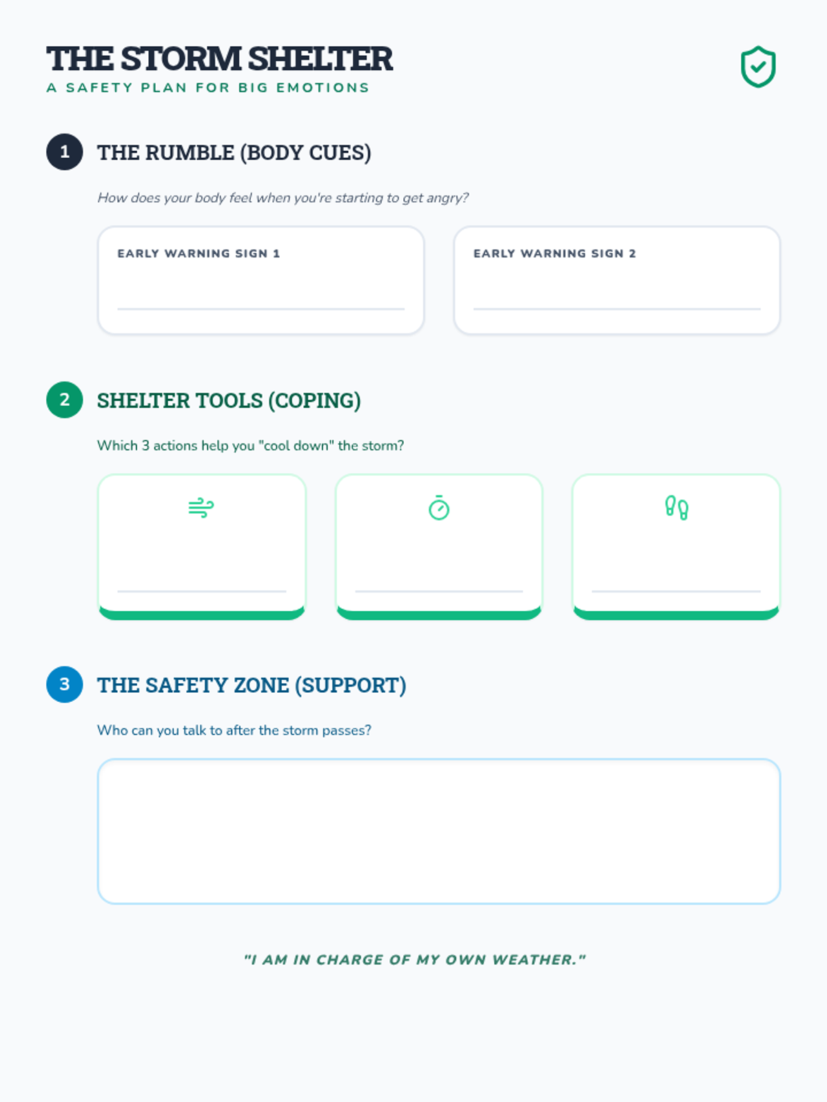 An anger-management and emotional regulation tool that helps students identify their physiological 'rumble' signs, select coping 'shelter tools', and identify their support system.