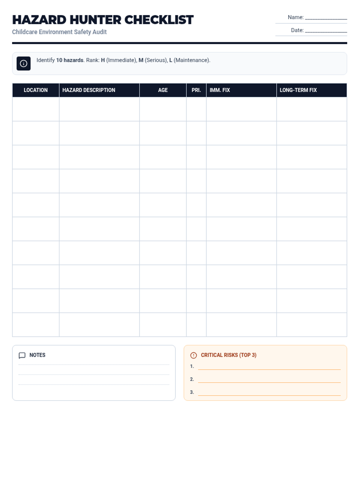 A structured observation checklist for students to use during the walkthrough activity, featuring columns for hazard description, age-affected analysis, priority ranking, and remediation steps.