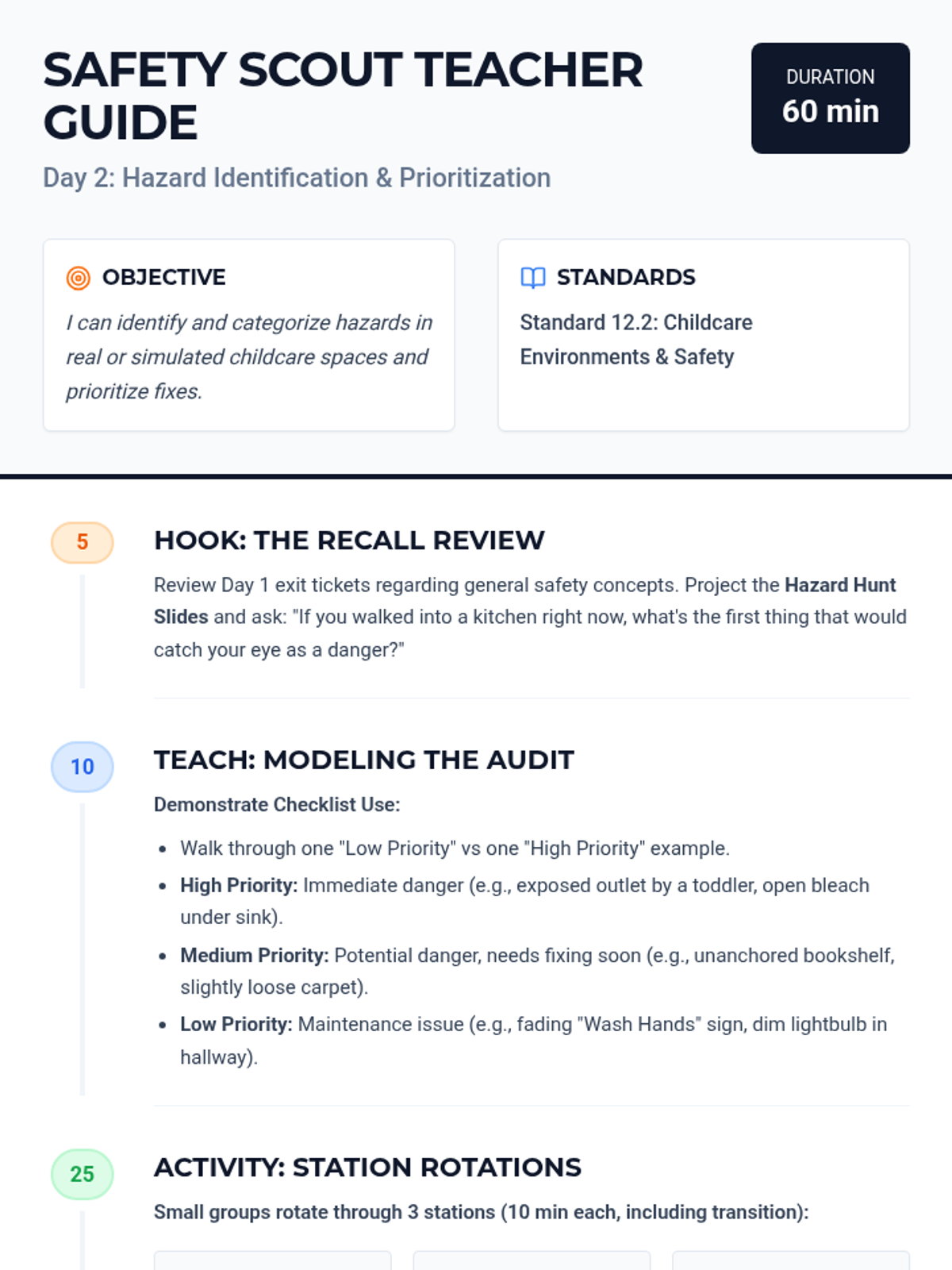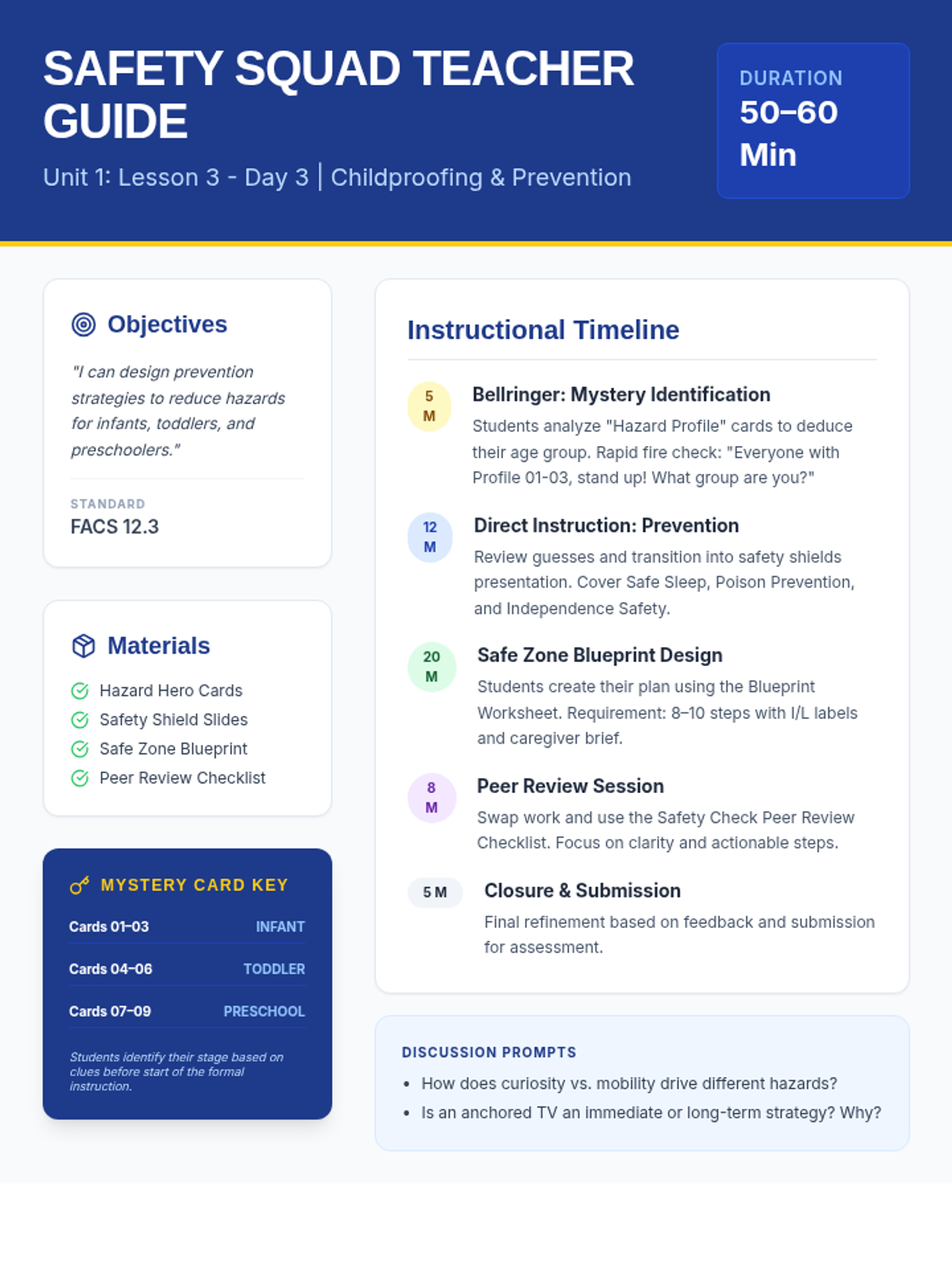 A comprehensive lesson guide for teachers, detailing the 60-minute instructional flow, objectives, and discussion prompts for teaching age-specific childproofing.