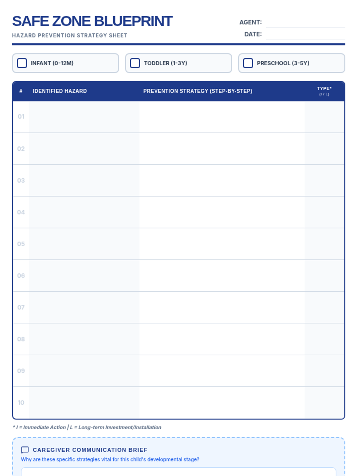 A professional blueprint-themed worksheet for students to design a 10-step childproofing safety plan for a specific age group.