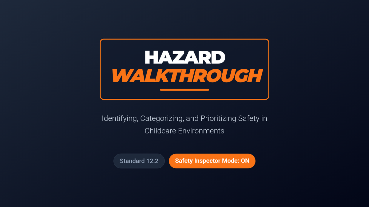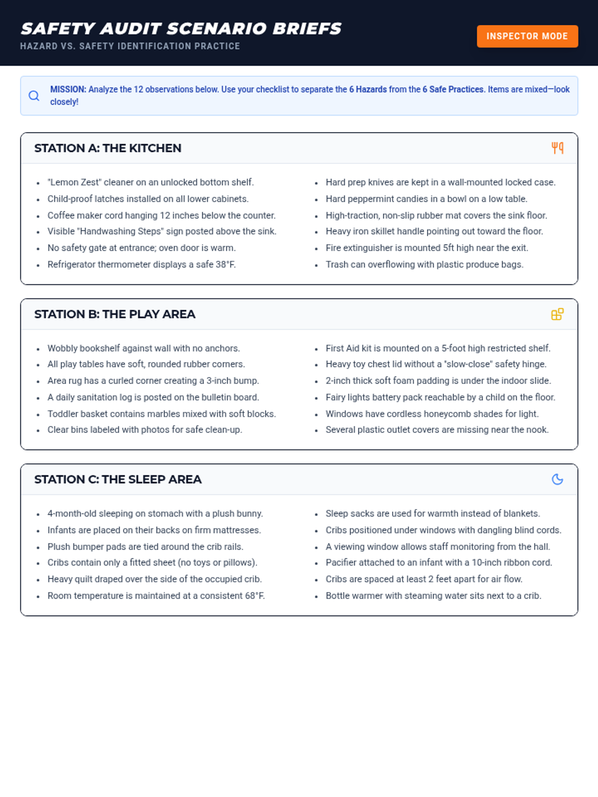 Descriptive station cards for the Kitchen, Play Area, and Sleep Area, presenting realistic childcare scenarios with a balanced and mixed list of 6 hazards and 6 safe practices per station.