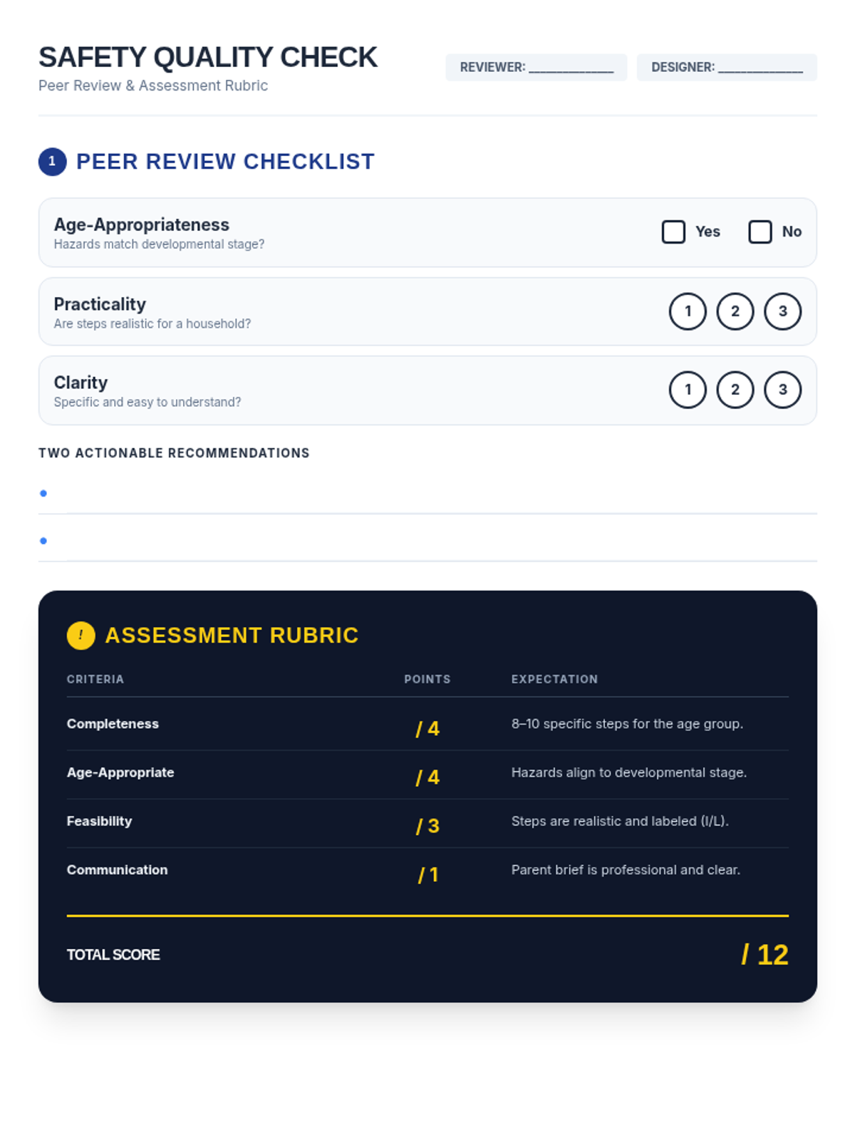 A comprehensive peer review checklist and grading rubric for the childproofing safety plan, featuring a 3-point practicality scale and clear point breakdowns.