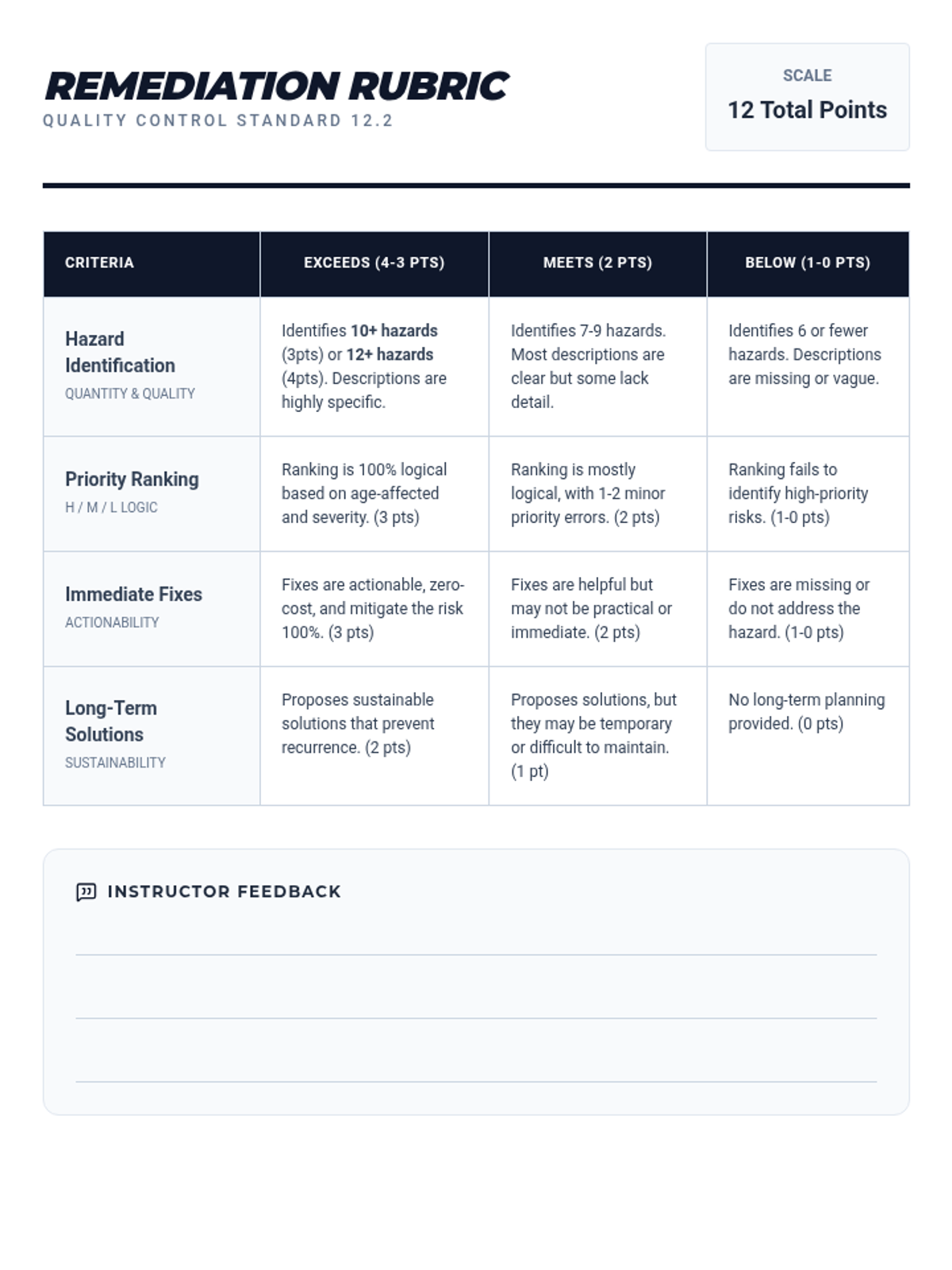 A clear and professional grading rubric for the remediation plan, assessing students on hazard identification, priority logic, and the feasibility of their proposed fixes.