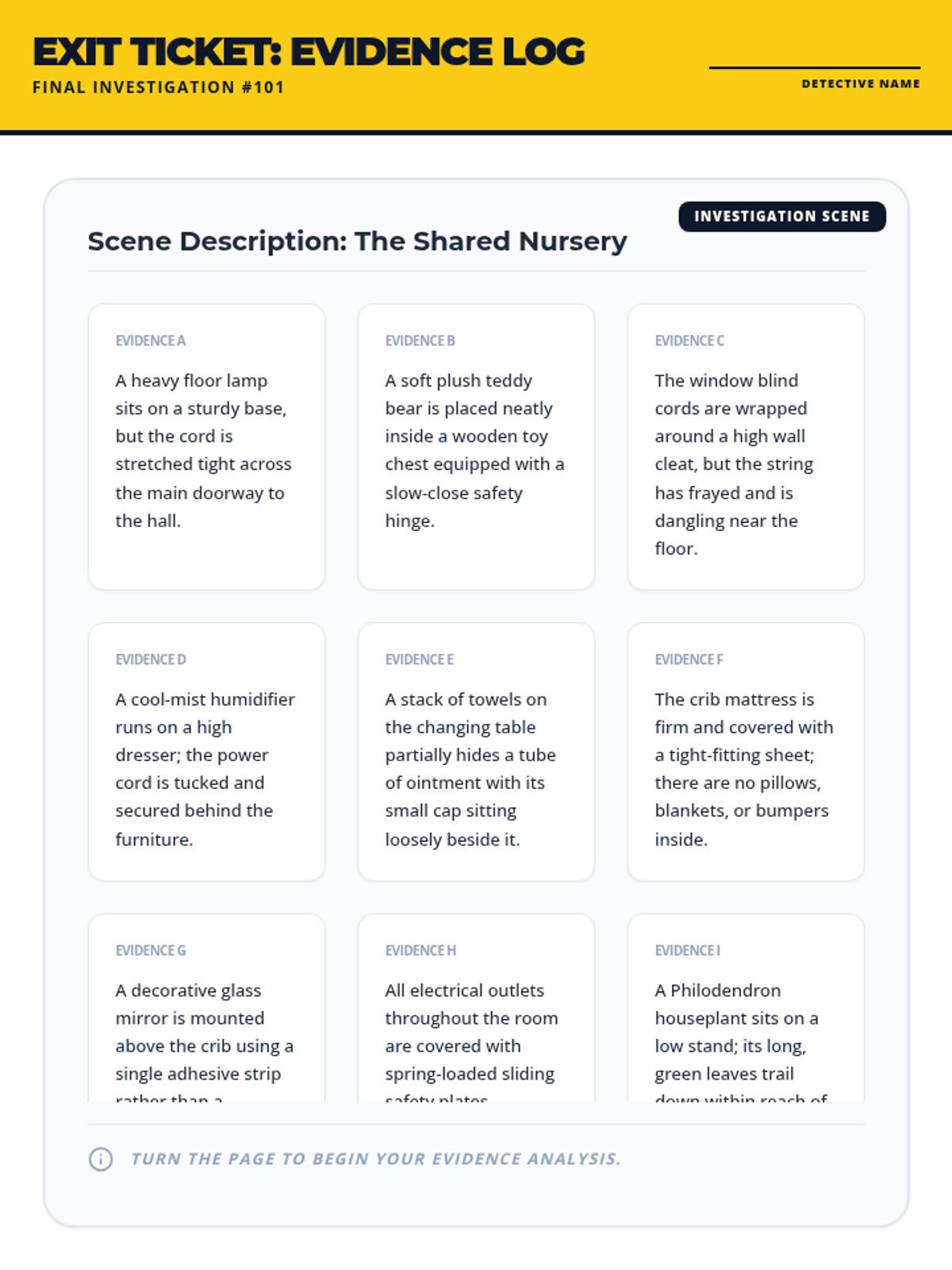 Updated the exit ticket assessment to feature a more complex "Nursery Scene" with 9 items (including distractors) to test students' ability to identify less obvious safety hazards and provide rationales.