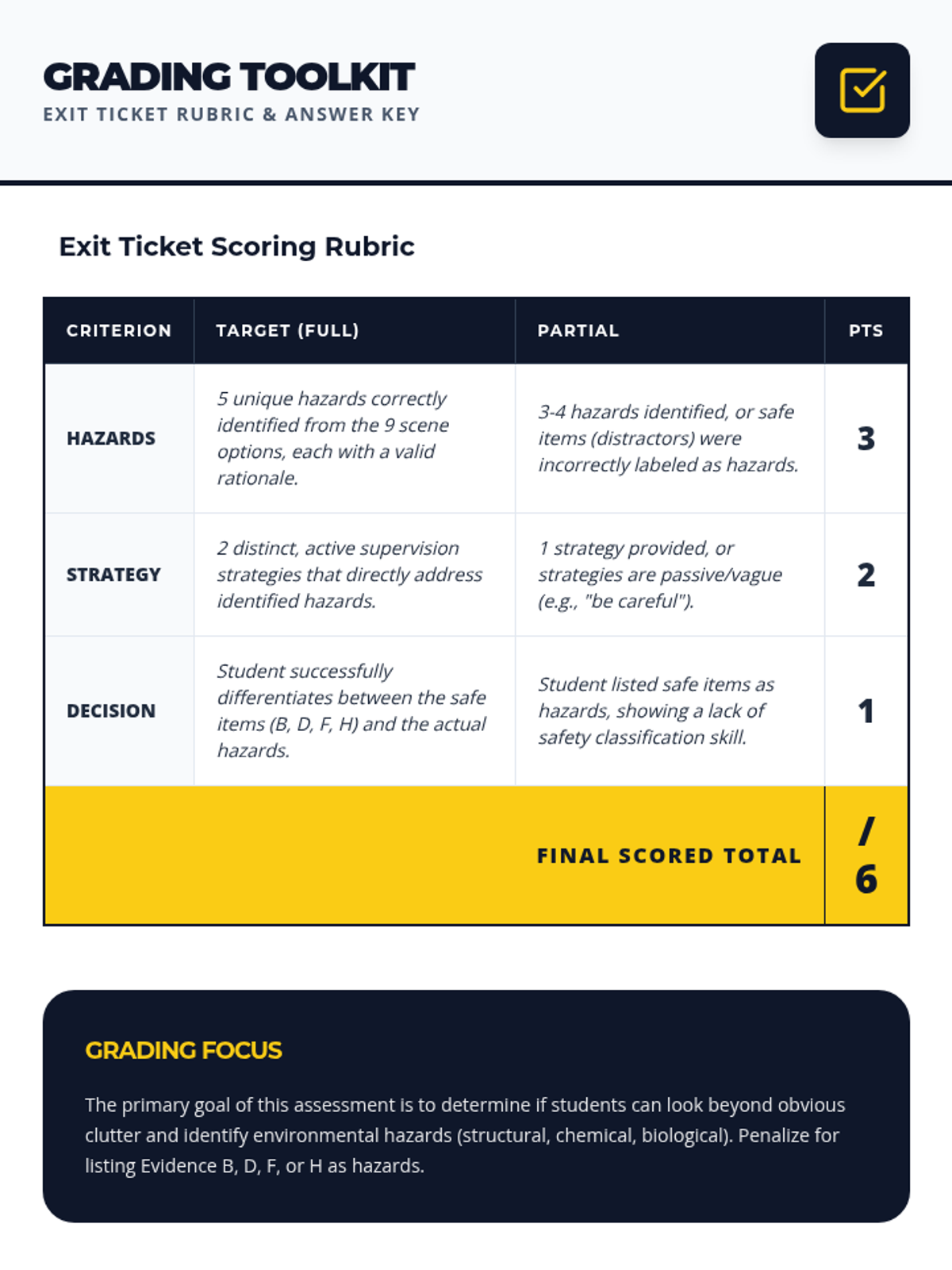Updated the grading rubric and answer key to reflect the more complex 9-item exit ticket, including specific classifications for hazards versus safe distractors.