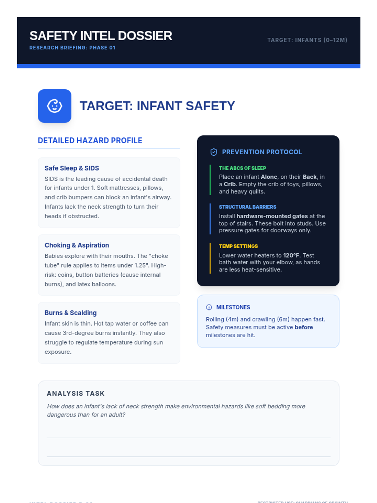 A comprehensive set of three expanded informational reading briefings for 7th-grade students, detailing specific hazards and prevention strategies for infants, toddlers, and preschoolers with in-depth explanations and analysis tasks.