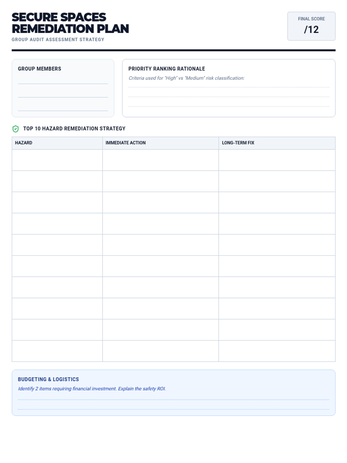 The culminating assessment template where student groups synthesize their walkthrough findings into a prioritized remediation plan, including budget considerations and rationale.