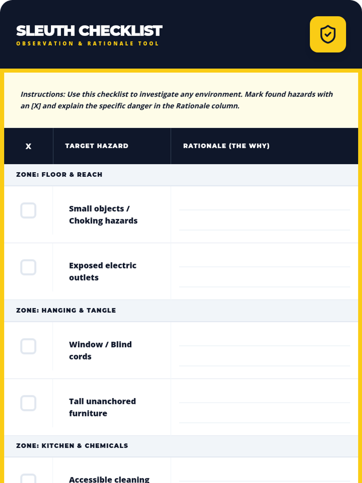 A scaffolded hazard checklist for the Safety Sleuths lesson, categorized by zone (Floor, Hanging, Kitchen, Outdoor) to support students during investigation activities.
