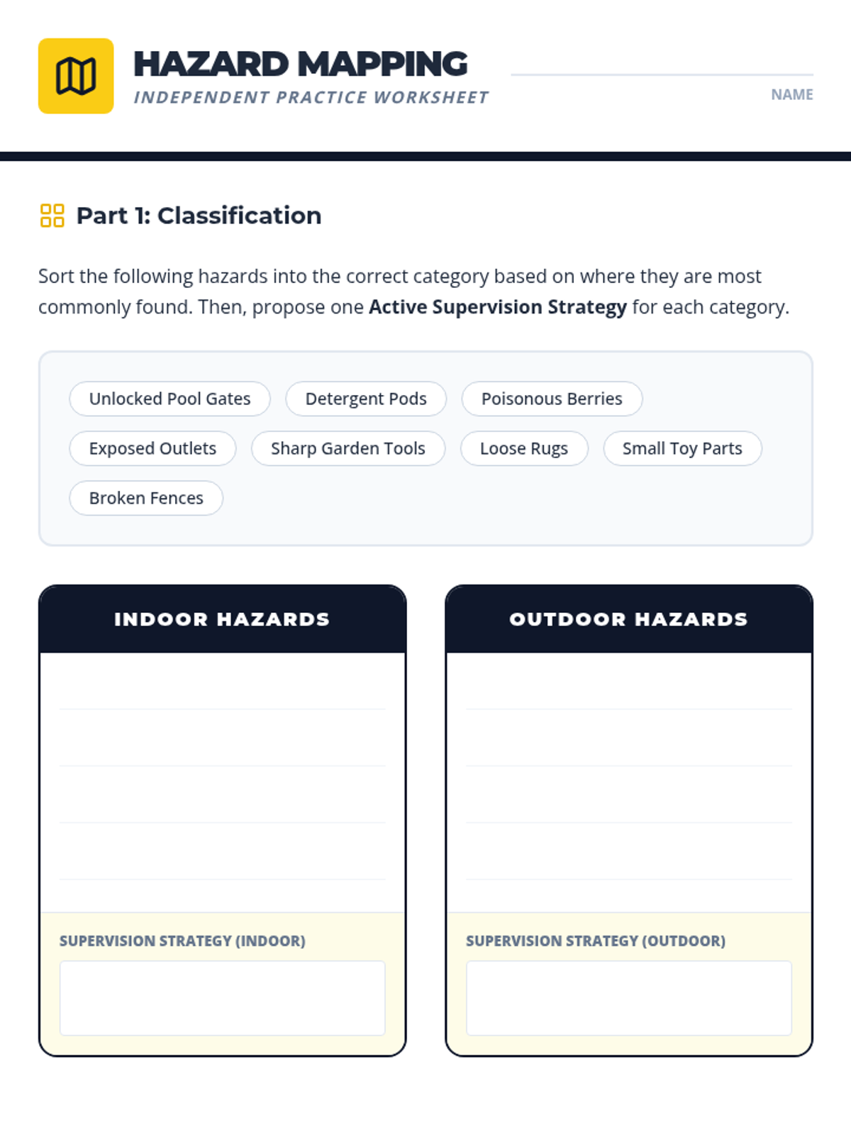 A classification worksheet for the Safety Sleuths lesson where students sort common hazards into indoor and outdoor categories and propose specific supervision strategies for each environment.