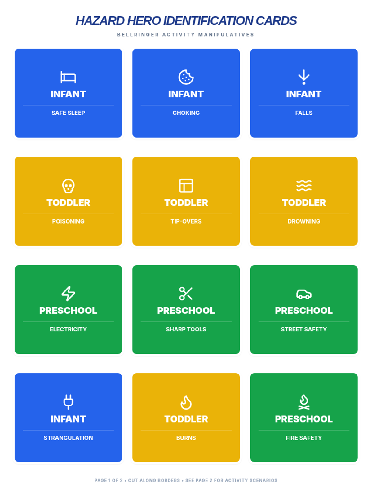 Printable activity cards for the Bellringer session, color-coded by age group, with each card featuring one specific hazard focus (Safe Sleep, Choking, Poisoning, etc.), along with a teacher reference sheet of 20 scenarios.