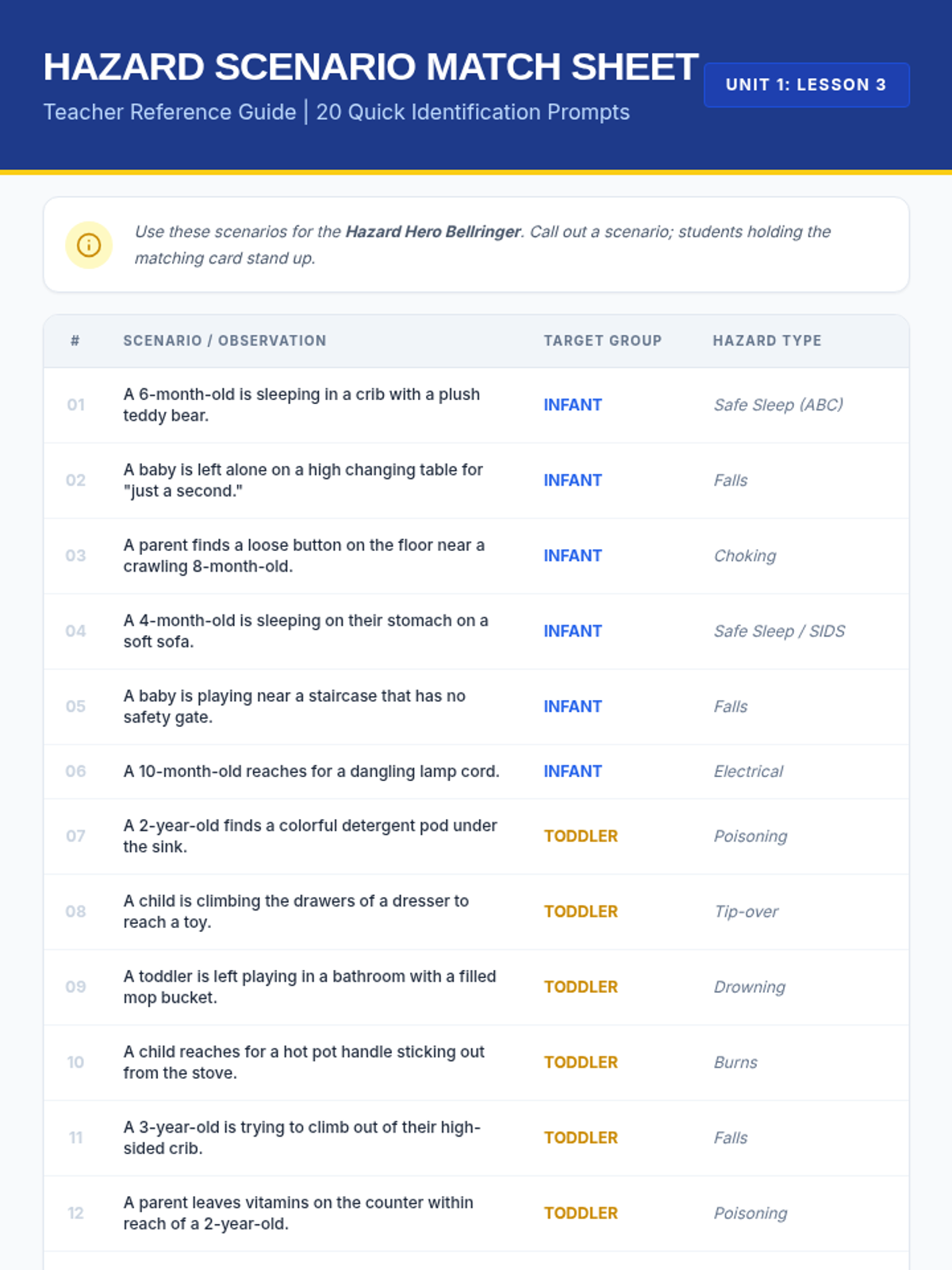 A comprehensive teacher-facing reference guide containing 20 scenarios across infant, toddler, and preschool age groups for the Hazard Hero matching activity.