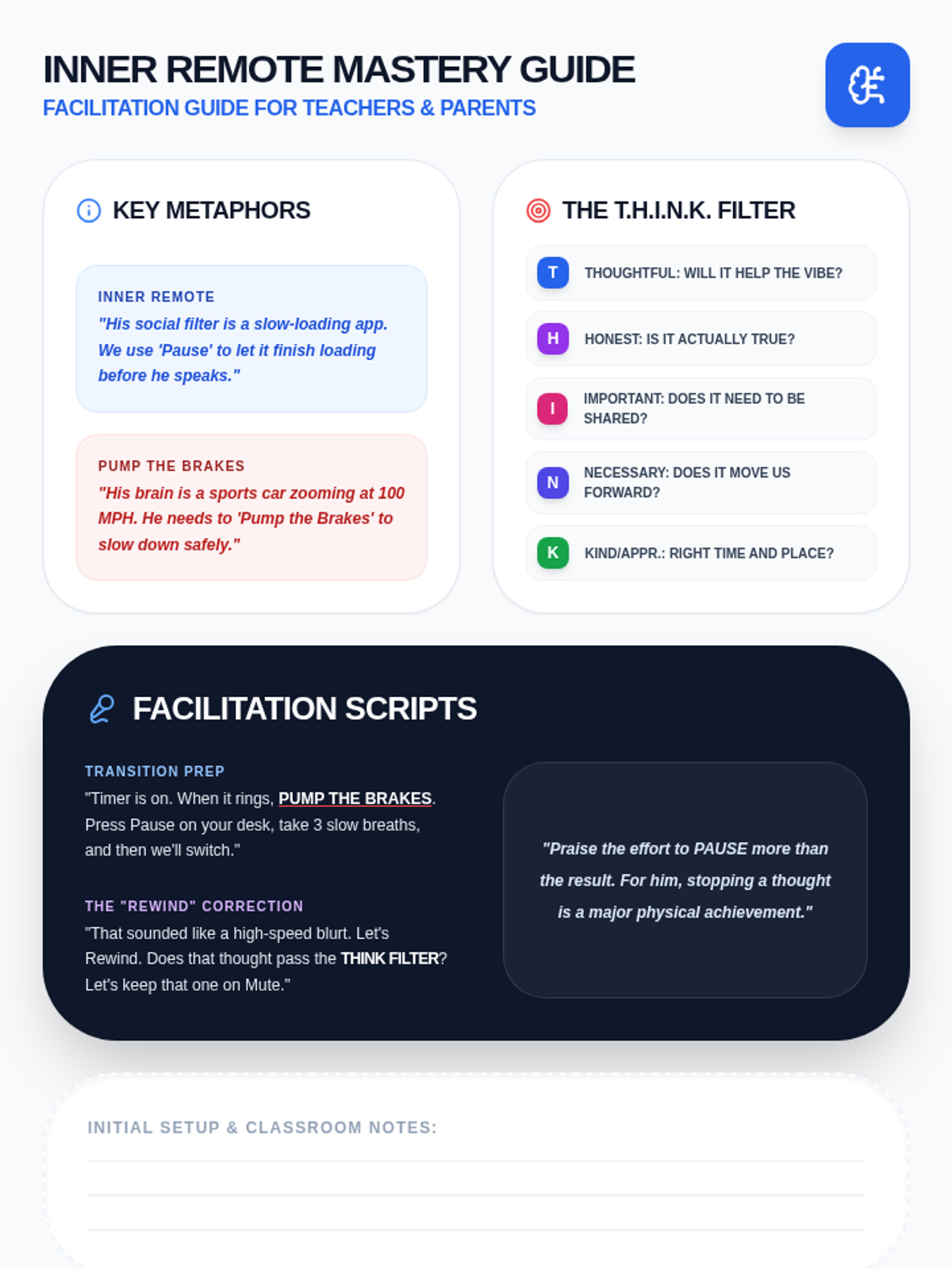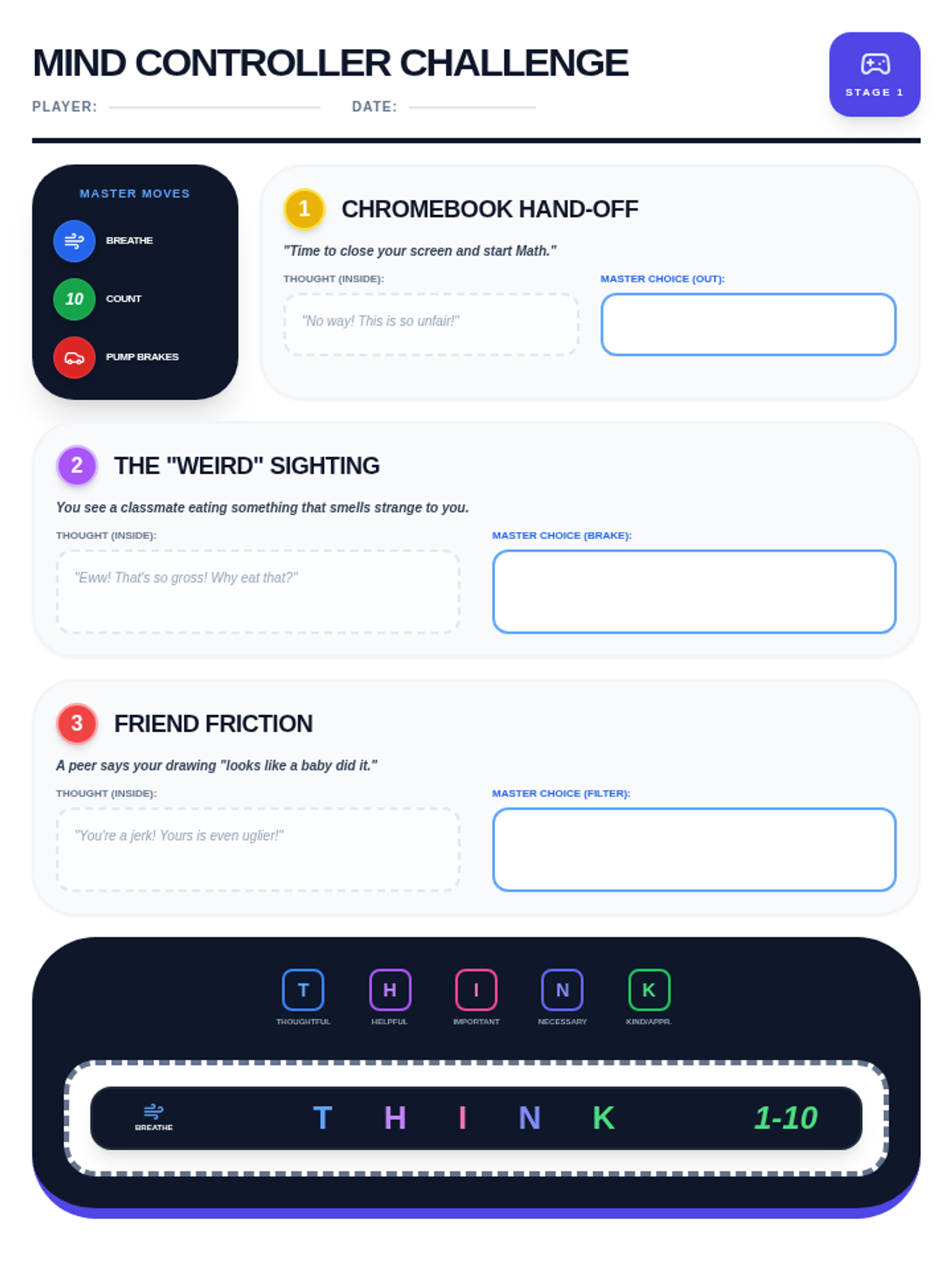 A facilitation guide for teachers and parents to help the student apply impulse control strategies. Includes scripts for specific scenarios, the THINK acronym breakdown, and an expanded observation log.