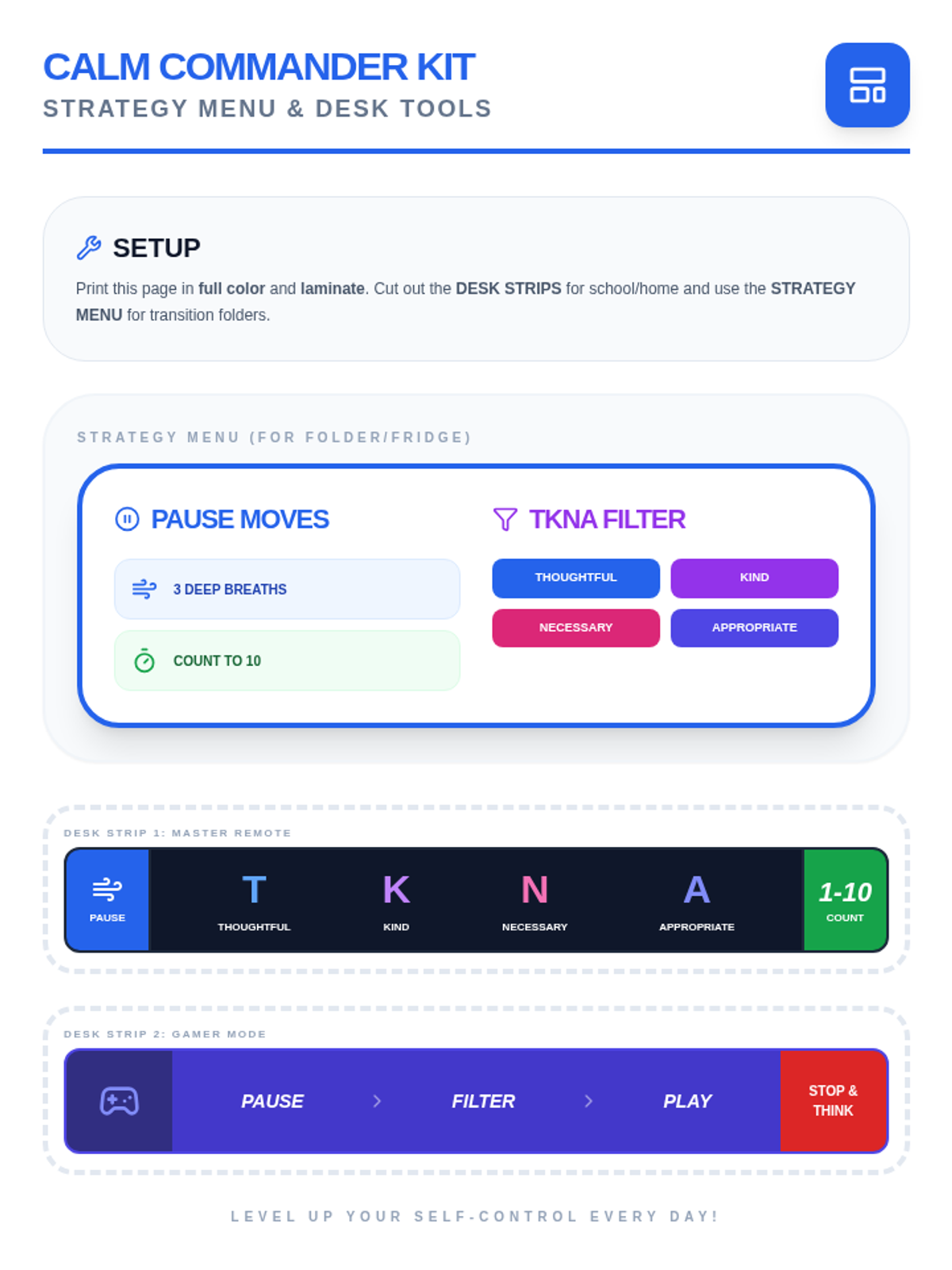 Printable desk strips and a strategy menu designed for an ADHD student. Features the TKNA filter (Thoughtful, Kind, Necessary, Appropriate) and the 'Pause' buttons in a high-contrast, gamer-themed aesthetic.