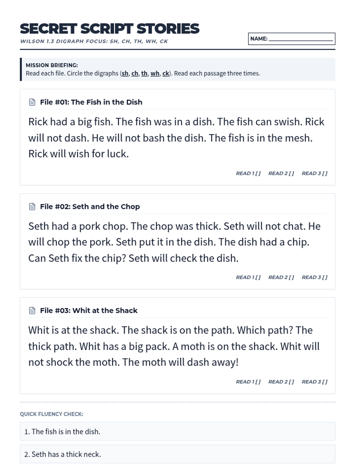 A collection of three decodable reading passages focusing on Wilson 1.3 digraphs (sh, ch, th, wh, ck) optimized to fit on a single page for student use, now including a quick fluency check section.
