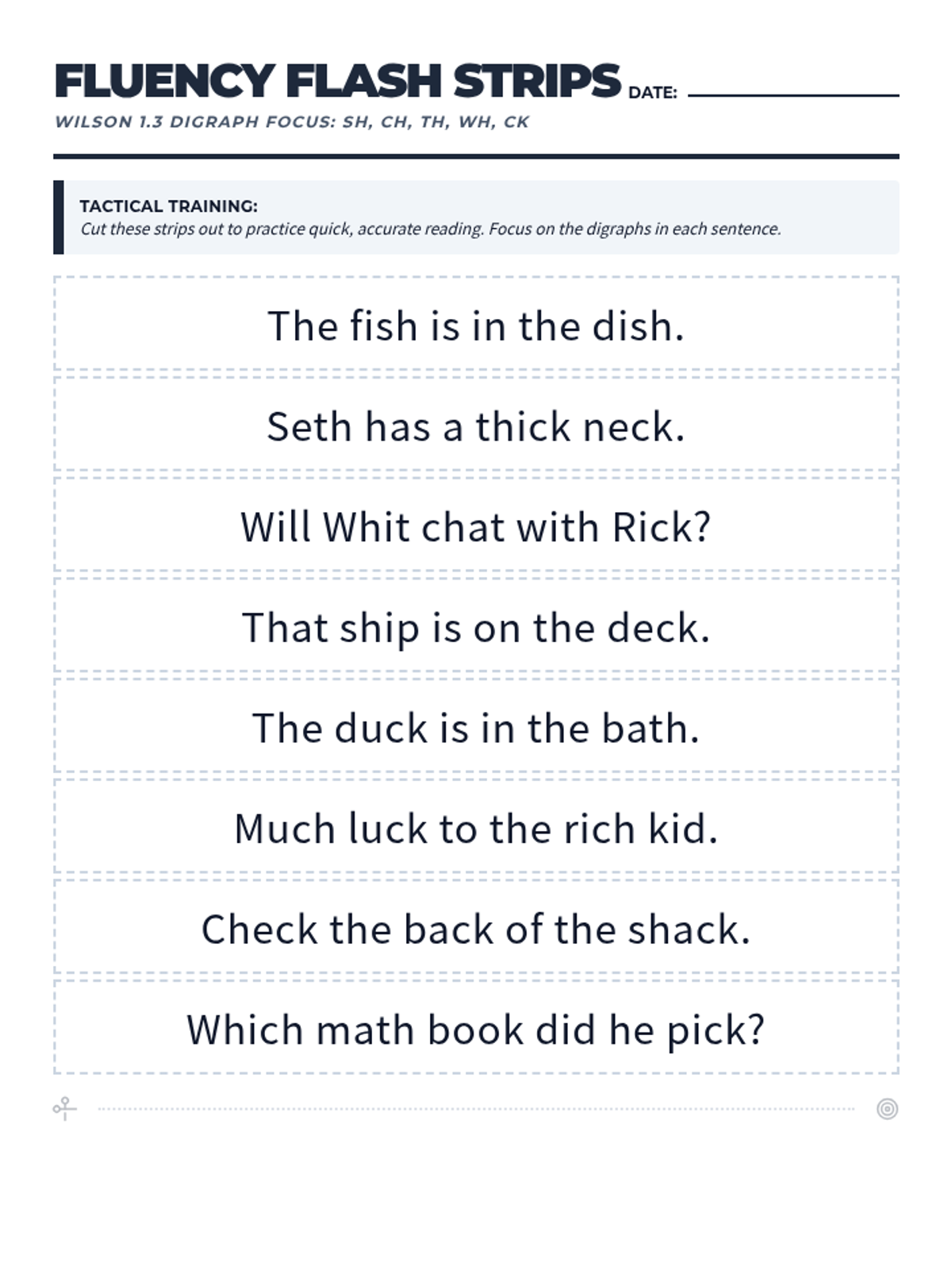 A single-page printable sheet of 8 sentence strips focusing on Wilson 1.3 digraphs for fluency practice. Optimized for space and efficiency.