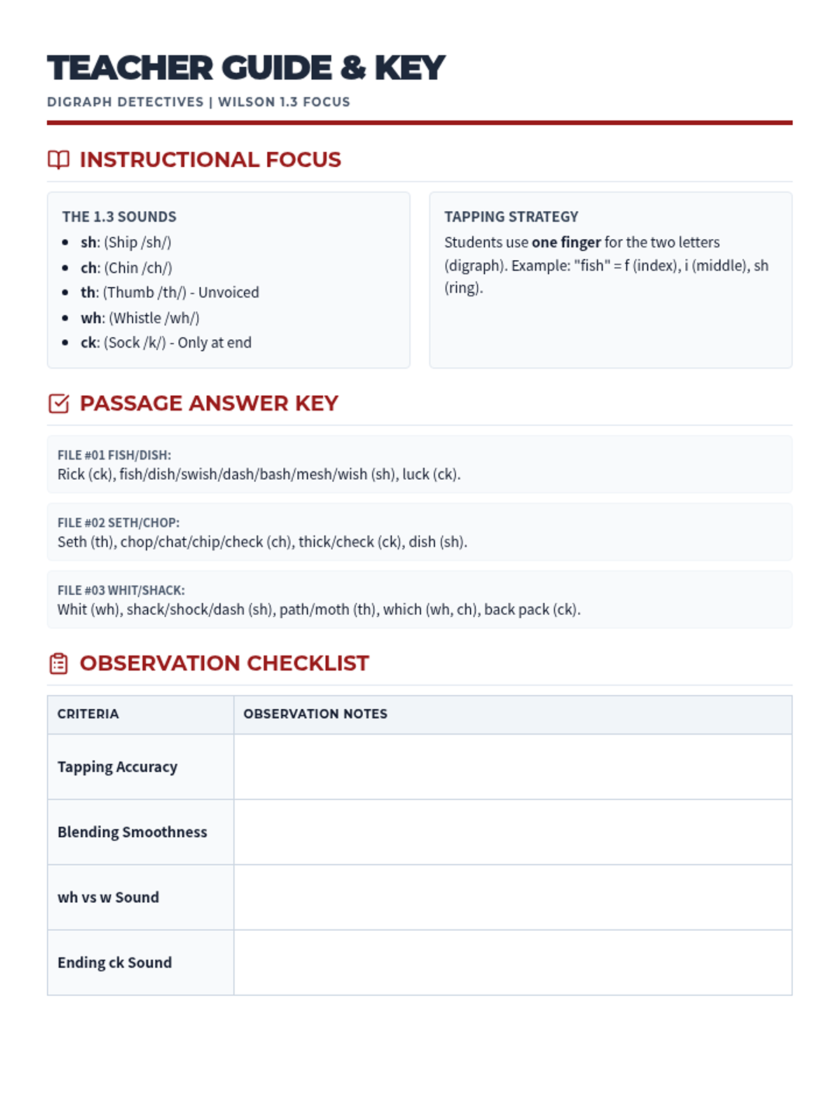 A teacher-facing reference guide containing answer keys, instructional tips for tapping digraphs, and a fluency observation checklist for Wilson 1.3. Optimized to fit on a single page.