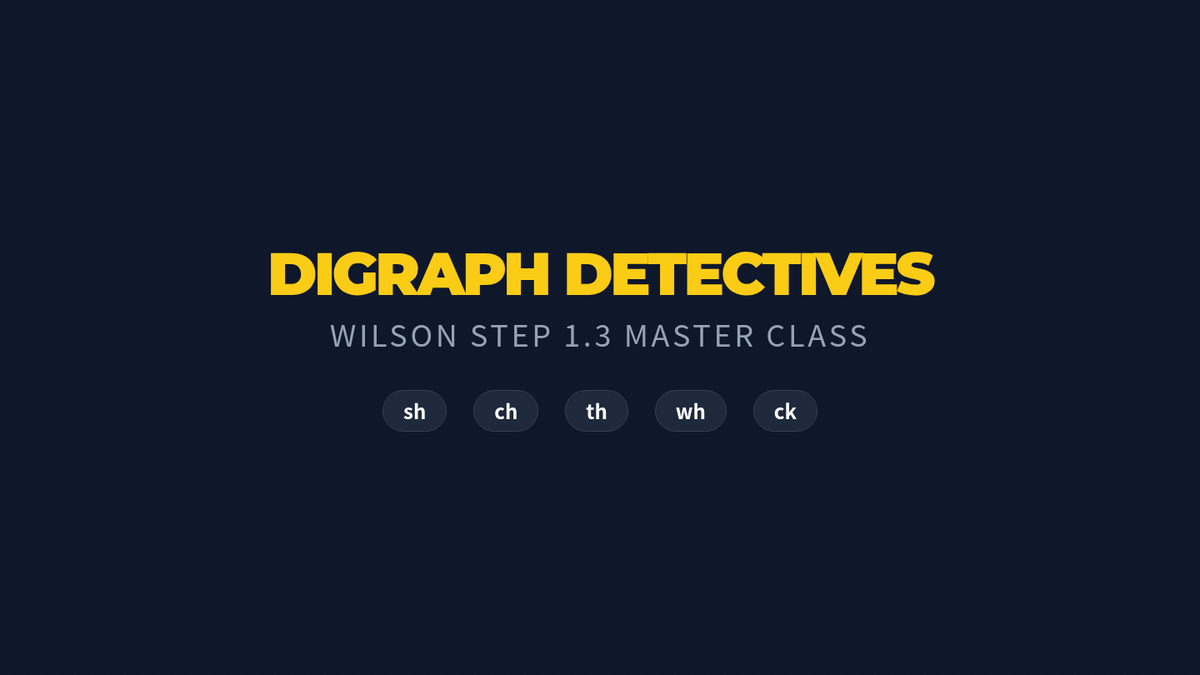 A visual presentation for teaching Wilson 1.3 digraphs, featuring word warm-ups and sentence reading challenges in a detective theme.