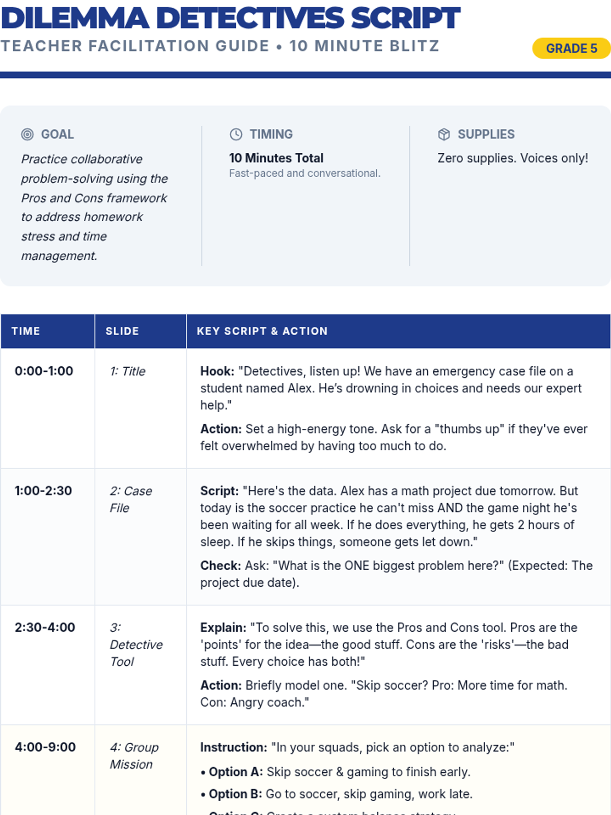 A structured teacher script for a 10-minute 5th-grade activity. It includes timing, hook lines, discussion prompts, and facilitation tips for the 'Dilemma Detectives' problem-solving lesson.