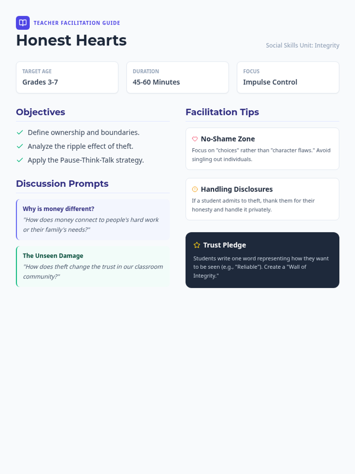 A teacher facilitation guide for delivering the Honest Hearts lesson, including learning objectives, discussion prompts, handling sensitive disclosures, and a closing activity suggestion.
