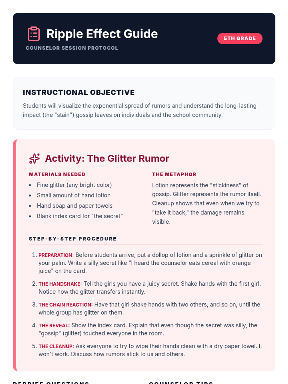 A counselor's guide for the "Glitter Rumor" activity, including materials, procedure, and debriefing questions to demonstrate how rumors spread.