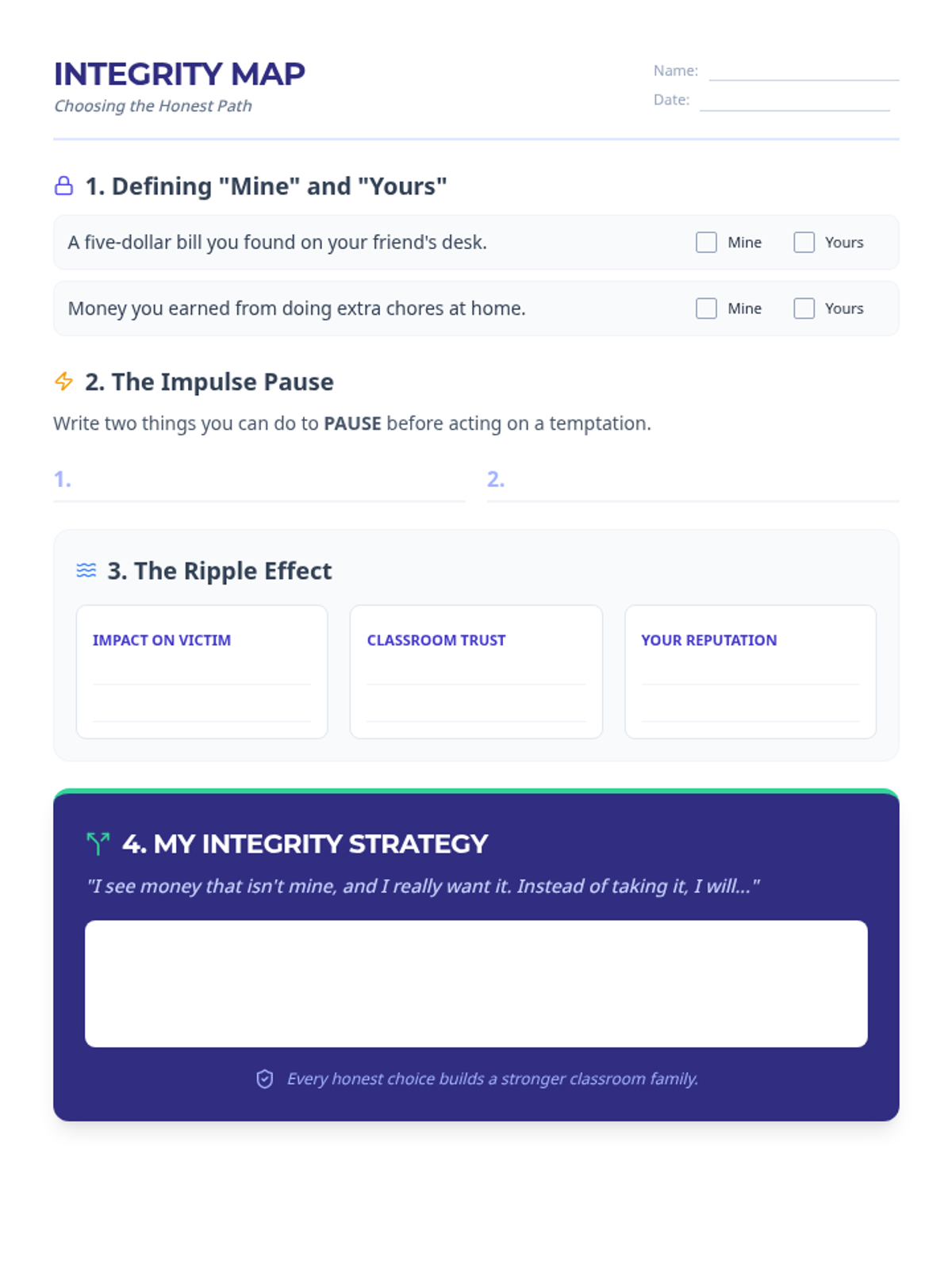A student worksheet for personal reflection on ownership, identifying impulses, analyzing the ripple effect of theft, and developing a personal strategy for making honest choices.