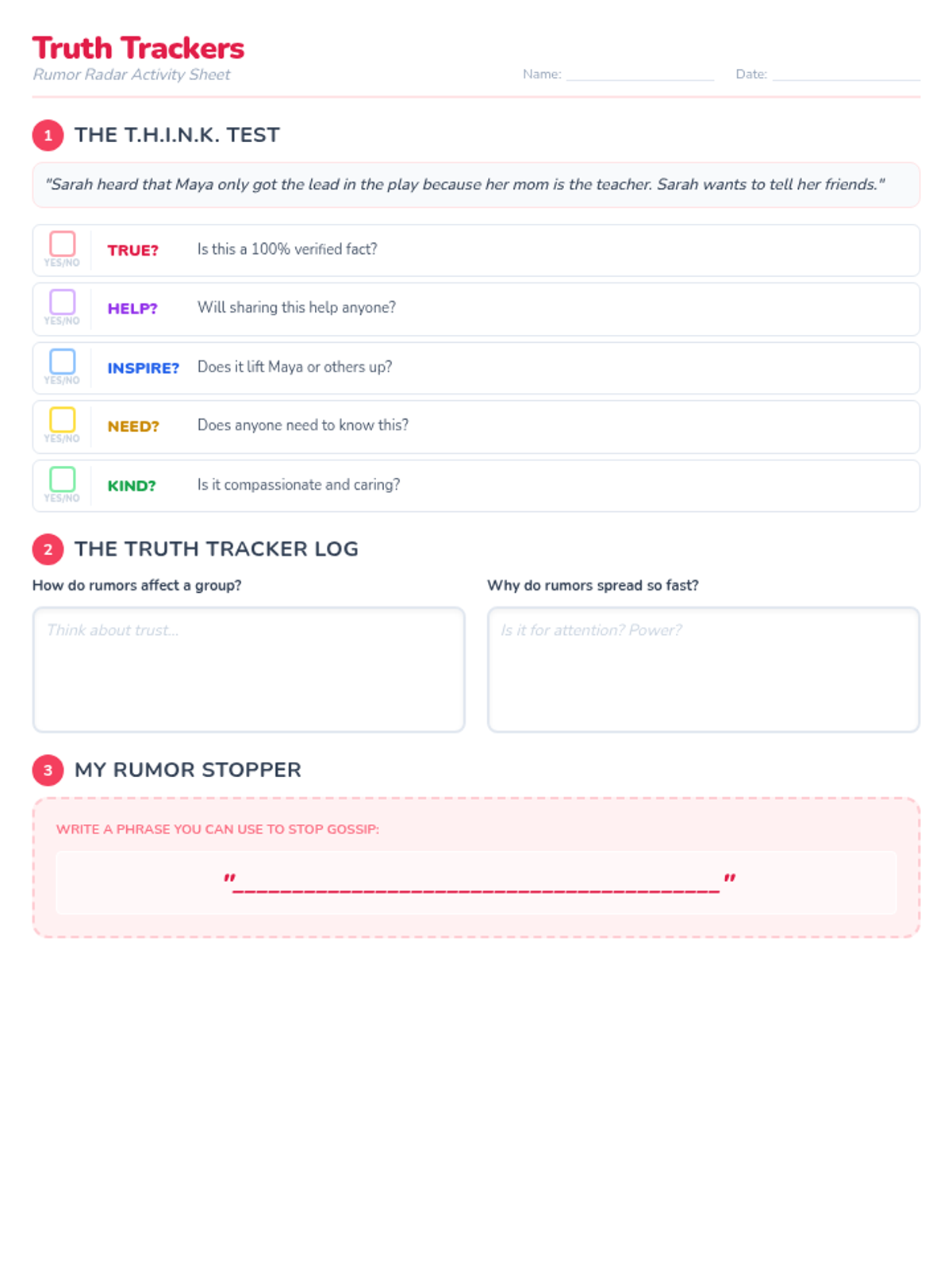 A worksheet for 5th-grade girls to practice applying the THINK test to rumor scenarios and reflect on the impact of gossip.
