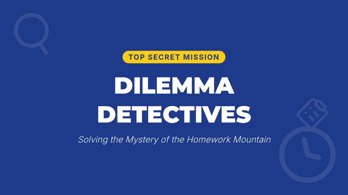 A vibrant, detective-themed slide deck for a 10-minute 5th-grade lesson on time management and pros/cons problem-solving. Includes a scenario about 'Alex' and structured prompts for group discussion.