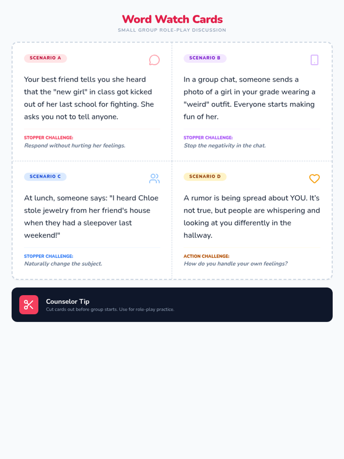 A set of scenario cards for small group role-play, focusing on common rumor situations 5th-grade girls face and practicing responses.