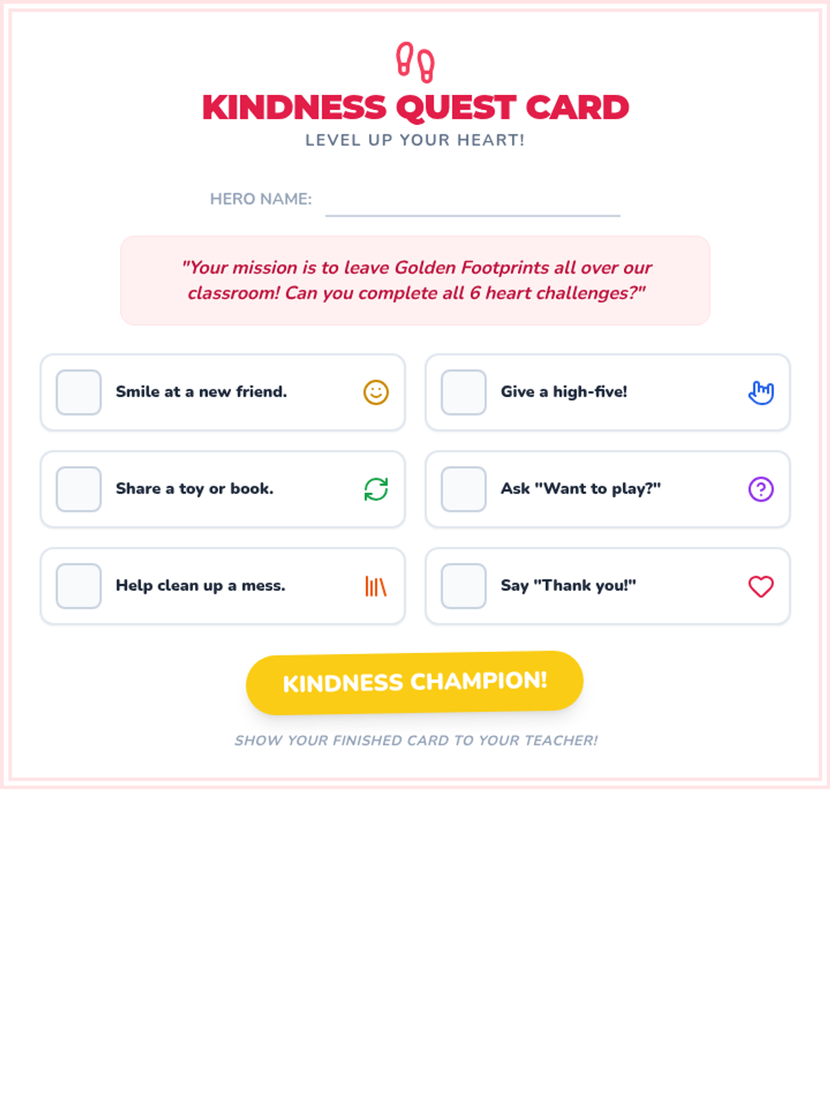 A student-facing kindness challenge card featuring 6 simple "missions" for perform inside the classroom, designed with a quest-like visual style for 1st graders. Final revision for improved readability, icon contrast, and handwriting space.