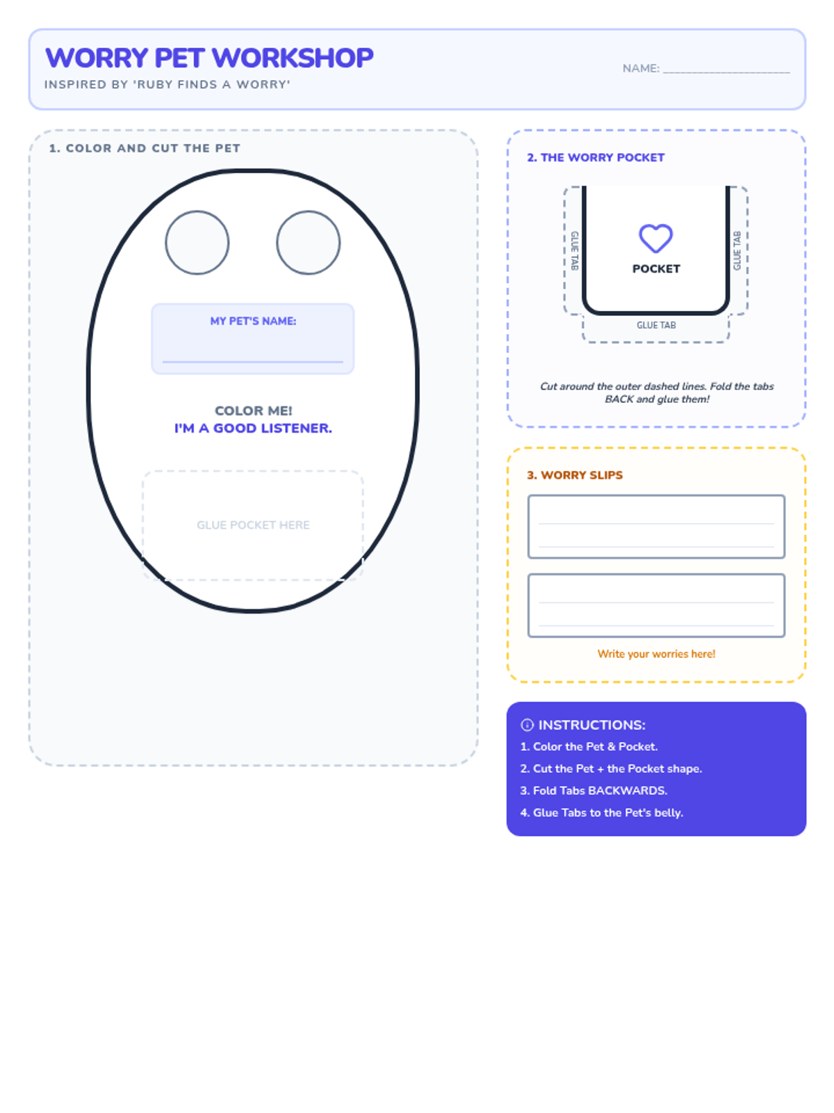 A hands-on craft activity where students build a paper 'Worry Pet' with a functional pocket and glue tabs. Includes built-in 'Worry Slips' for immediate use. Revised for functionality and layout.