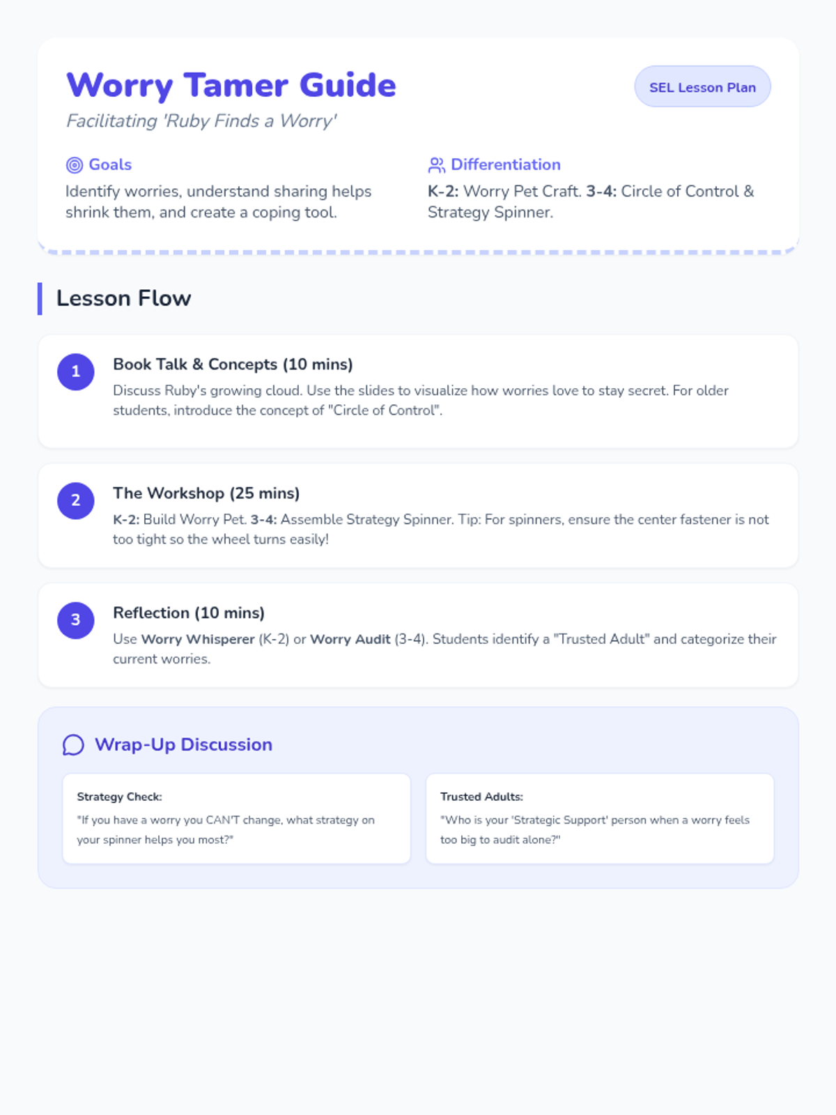 A teacher's guide for a social-emotional learning lesson based on 'Ruby Finds a Worry'. Revised to fit on a single page with high-contrast text and a more compact layout.