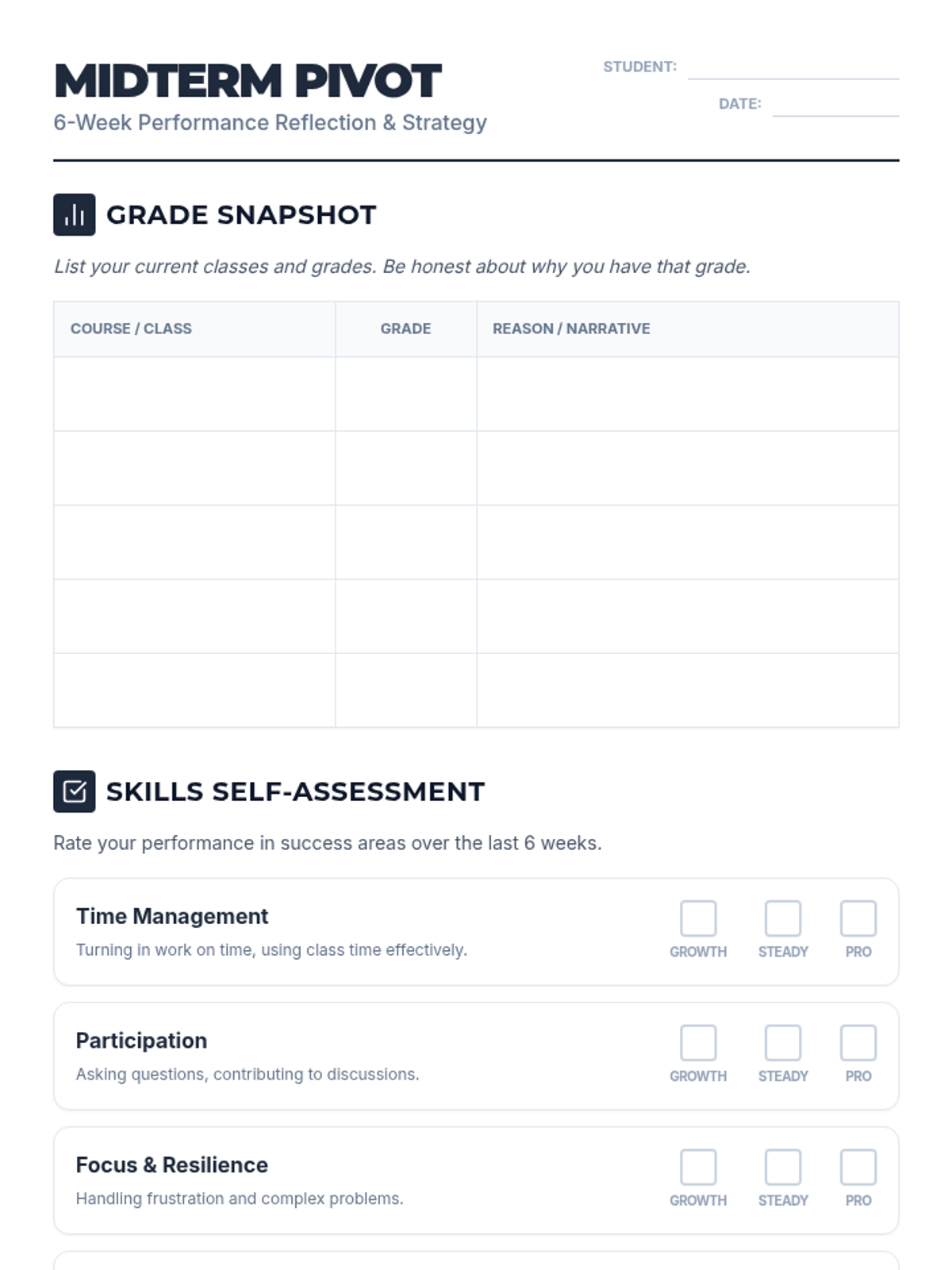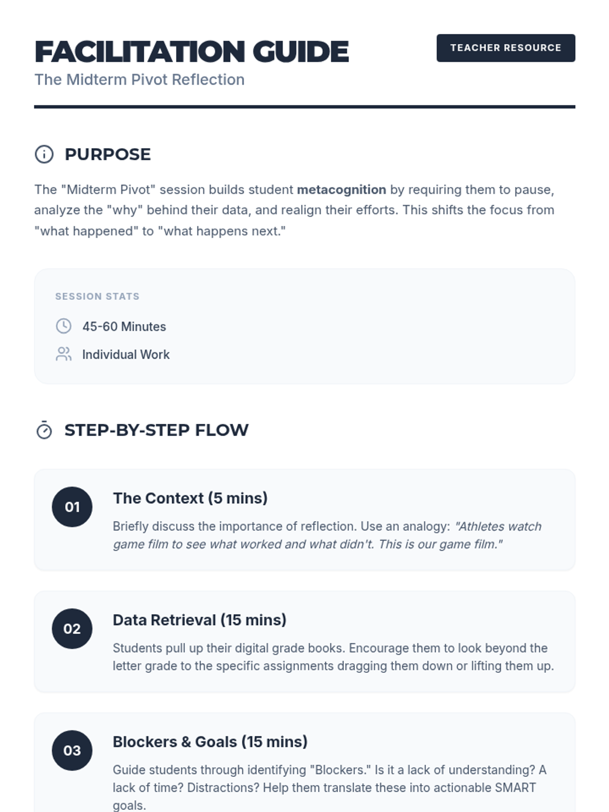 A guide for teachers on how to facilitate the Midterm Pivot reflection session, including pacing, discussion prompts, and conferencing strategies. Revised for better page layout and clarity.